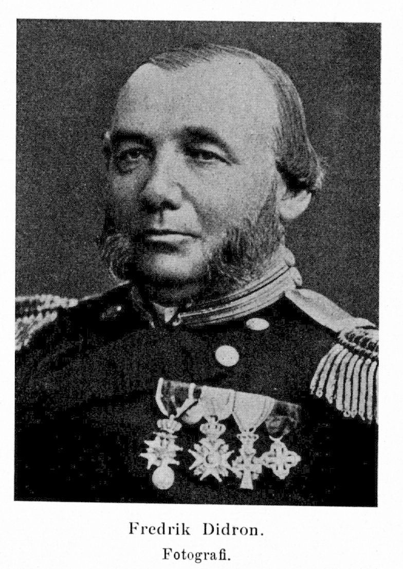 2. Fredrik Herman Didron, f. 7 dec. 1817 på Hallkved, Funbo sn (Upps.), d. 30 okt. 1886 i Stockholm. Föräldrar: bruksägaren och assessorn Johan Herman Didron och Lovisa Christina Horneman. Extra kadett 1833—34; sjöofficersex. i Karlskrona 21 maj 1836; sekundlöjtnant vid flottan 14 juli 1837; premiärlöjtnant 19 nov. 1845; genomgick Falu bergsskola 1847—49; kontroll-och besiktningsofficer vid kanon- och projektilleveranser, tillverkning av ankarkättingar m. m.; deltog därjämte i åtskilliga skjutförsök 1849—72; beordrades att i Norge taga kännedom om kättingtillverkningen 1851—52; kaptenlöjtnant 26 maj 1854; kapten 27 mars 1858; besökte kanongjuterier i England, Frankrike och Belgien s. å.; led. av kommittén för försöksskjutning mot olika pansarbeklädnad 15 sept. 1863; överförd till flottans nya reservstat 1 okt. 1866; kommendörkapten vid nämnda stat s. d.; beordrad att i Köpenhamn övervara försöksskjutningar mot pansartavla 1868; kommendör vid samma reservstat 6 dec. 1872; statsrevisor 1879— 1886, statsrevisionens ordf. 1880—86; stadsfullmäktig i Stockholm 1880—84; kyrkorådsled. i Ladugårdslands förs.; inspektör för båtsmanshållets östra distrikt 1880—85. LKrVA 1866; RSO 1861; KSO1kl 1884. G. 25 sept. 1859 i Göteborg m. Ebba Josefina Blidberg, f. 18 febr. 1835 i Göteborg, f 23 juni 1899 i Södertälje, dotter av klädeshandlaren Peter Blidberg och Ulrika Eleonora Hjelmberg.
