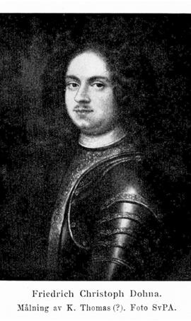 2. Friedrich Christoph Dohna, son till D. 1, f. 28 dec. 1663 (familjeanteckn., KB) på Karwinden, d. 9 juli 1727 i Wismar. Kapten i hannoveransk tjänst; deltog i O. W. von Königsmarcks expedition till Morea 1685; i svensk tjänst 1687; plenipotentiarie till kejserliga hovet i Wien 1687 (instr. 19 nov.)—1690, till valdagen i Augsburg 1689 och till kurfurstliga hovet i Königs-berg 1690; i svensk militärtjänst 1691—5 mars 1692; överste för ett kursachsiskt reg. 1693—11 nov. 1694; generalmajor i preussisk tjänst 1695; generallöjtnant 1700; brandenburg-preussisk envoyé extraordinaire i Sverige 1697 (kreditiv 7/19 dec.)—1701; preussisk amtshauptmann i Ragnit till 1719; svensk generallöjtnant 19 dec. 1720; president i Wismarska tribunalet 31 jan. 1722.