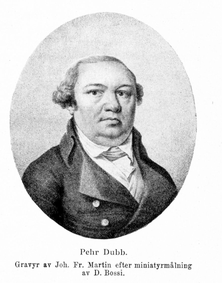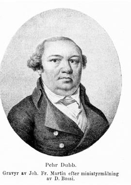 1. Pehr Dubb, f. 14 jan. 1750 i Mariestad, d. 6 jan. 1834.i Göteborg (Kristine). Föräldrar: stadskassören och vågmästaren Gustaf Dubb och Johanna (Jeanna) Billinggren. Gick i skola i Mariestad och Skara; student vid Uppsala univ. 12 sept. 1768; med. kand. där 18 dec. 1775; med. lic. 16 dec. 1776; disp. 1 nov. 1777; med. doktor 19 nov. 1778; med. jubeldoktor 15 juni 1827; fattigläkare vid Sätra brunn 1774—76; studieresa maj 1779—dec. 1780 i Tyskland, Holland, Frankrike och England; amiralitetsmedikus vid arméns flotta i Göteborg 20 aug. 1781—1812; läkare och styresman vid Sahlgrenska sjukhuset där 1782—1804; förste fältläkare vid västra fördelningen 1788, likaså 1801 och 1808; behöll enligt generalorder 15 juli 1808 som sådan högsta inseendet över sjukhusen i Göteborg, Strömstad och Tingvalla samt över all läkarstat tillhörande 5:e och 6:e brigaderna; led. av borgerskapets äldstes beredningskommitté för förbättrade försörjningsanstalter i Göteborg 1795 och ordf. i direktionen över arbetshuset och fattigförsörjningsanstalterna där 20 dec. 1799—1829; led. av karantänskommissionen i Göteborg 27 dec. 1804—4 sept. 1818; led. av kommittén till beredning av en allmän fattigvård i riket 10 jan. 1810. Ämnessven i VA 1778; LVVS 1786 (preses 1805—06); LFS senast 1794; LVA 1795; led. av Patriotiska sällskapet 1802; RVO 1805; KVO s, å.; RCXIIIO 1811; hedded. av Collegium medicum 1811; led. av Svenska läkaresällskapet 1813; led. av hushållningssällskapen i Göte-' borgs, Värmlands och Skaraborgs län s. å.; led. av bibelsällskapet i Göteborg s. å.; korrespLLA 1814; KmstkVO 1826. — Ogift.