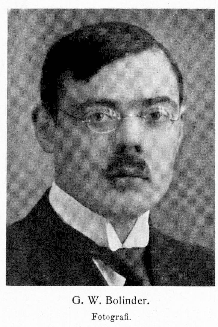 Bolinder, Gustaf Wilhelm, f. 19 dec. 1888 i Göteborg. Föräldrar: bokförläggaren Hans Ludvig Bolinder och Lydia Strandberg. Elev vid Göteborgs h. latinläroverk 1900−05 och vid Göteborgs h. samskola 1905−07; avlade mogenhetsexamen maj 1907; student i Uppsala ht. s. å.; studerade först juridik men övergick ht. 1911 till filosofiska fakulteten; fil. kand. 8 apr. 1914; inskrevs vid Göteborgs högskola ht. 1918; fil. lic. därstädes 30. nov. s. å.; disp. 12 dec. s. å.; fil. doktor 17 sept. 1919. Har sedan 1914 varit verksam som forskningsresande, skriftställare och populär föreläsare.