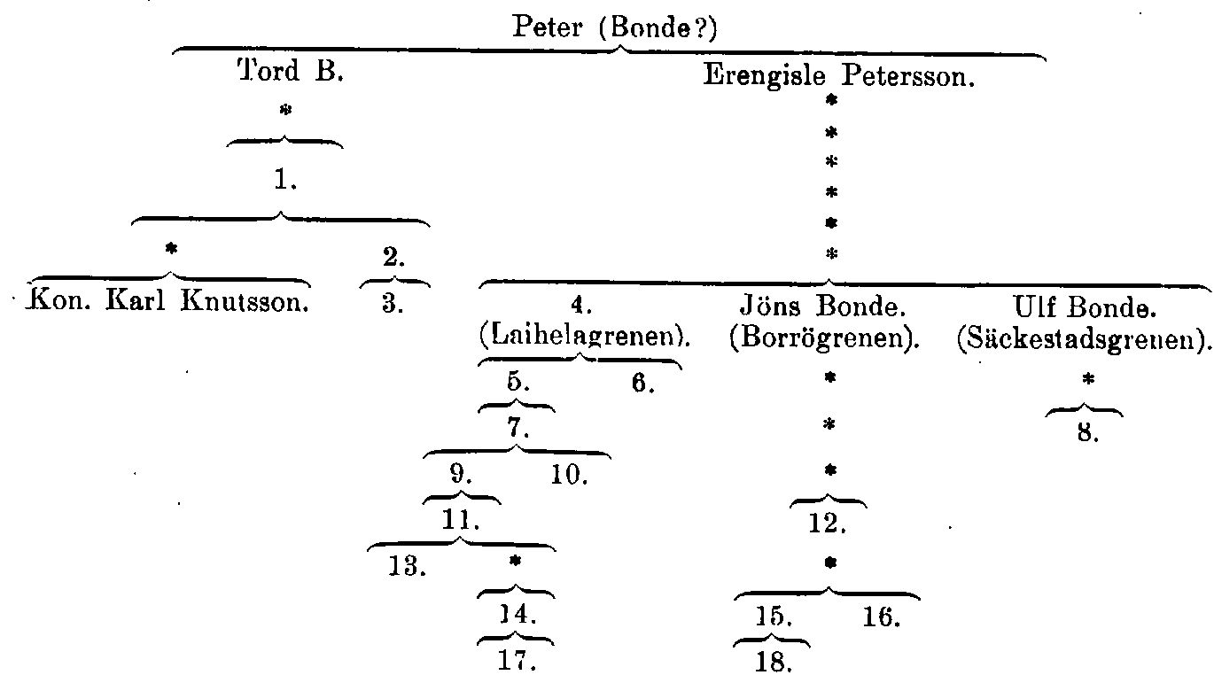 Källor: Pergamentsbrev, RA och UB; kopieböckerna A 20, B 15 och B 16, RA; pergamentsbrev, dat. Kalmar 26 febr. 1391 i Sverige: Småland, 29, Danska riksark. (ang. Erengisle Bonde [båt]); Sv. [LagerJBring, Samling af åtskilliga handlingar ... i swänska historien, 3 (1758), s. 252 o. följ. (ang. Karl Karlsson); Diplomatarium Svecanum, 1—6 (1829—1921; sigillbeskrivningen till brevet 19 maj 1325, n. 2517, felaktig, i det att ett sigill där med orätt hänförts till Tord Bonde i st. f. till Erengisle Torkelsson); B. E. Hildebrand, Sv. sigiller fr. medeltiden (1862—67); Kon. Gustaf den förstes registratur, 1—29 (1861—1916); Missiver fra Kongerne Christiern I:s og Hans' Tid, udg. ved W. Christensen, 2 (1914), s. 24 (ang. Tord Filipsson B.); Olaus Magnus, Historia de gentibus septentrionalibus (1555), lib. 14, cap. 14; Scriptores rerum Suecicarum medii sevi, 1, 3 (1818, 1871—76); Stockholms stads tänkeböcker 1483 —92, h. 2(1924); Sv. medeltidens rimkrönikor, utg. af G. E. Klemming, 2 (1866); Sv. riksarchivets pergamentsbref fr. o. m. år 1351, 1—2 (1866—68); Sv. riks- dagsaktcr 1521—1718, 1—2 (1887—99); Sv. diplomatarium fr. o. m. ar 1401, 1—3 med supplement (1875—1904); Sverges traktater med främmande magter, utg. af O. S. Rydberg, 1—3 (1877—1895). — C. Annerstedt, Svenska medeltidens frälsesläkter (manuskript; detta stora arbete med dess rikhaltiga genealogiska upplysningar har tack vare förf: s godhetsfulla erbjudande kunnat utnyttjas för denna artikel ävensom för de följande biografierna över medeltida medlemmar av Bondeätten); K. Fabricius, En nordisk lensmands liv i det 15de århundrade (Hist. tidskr., 1904, s. 297 o. följ.; ang. Karl Karlsson); K. H. Karlsson, Bondeslägten under medeltiden (Sv. ättartal, G, 1890); G. O. F. Westling, Det nord. sjuårskrigets historia (1879); F. Ödberg, Om vestgöta-adelsmannen Tord Bonde till Stensholmen och hans tid (Västergötlands fornminnesfören. tidskr., II, h. 2—3, 1903). — Se i övrigt, ang. de Bondeska arkiven och biblioteken: ovannämnda tryckta förteckningar över Sävstaholmsarkivet, C. M. Carlander, Sv. bibliotek och exlibris, 2—3 (1904) samt brev till K. Kr. Gjörwell från E. af Sotberg 21 juli 1779 och från A. Schönbcrg 13 dec. 1808 och 1811 (meddelande av andre arkivarien W. Enblom).