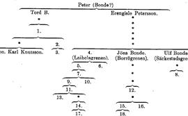 Bonde, jämte ätterna Bielke och Natt och Dag den äldsta svenska adelsätt av rent inhemskt ursprung, som ännu fortlever. Möjligen var redan riddaren Torer Bonde, som något av åren 1282—86 i Vreta kloster bevittnade stadfästelsen av en till klostret gjord donation och vars dödsdag (men ej dödsår) är antecknad i Stockholms gråmunkeklosters kalendarium, en medlem av ätten; han är i varje fall den tidigaste storman med tillnamnet Bonde, som möter i källorna. Det dokumentariskt styrkta ättartalet utgår emellertid från bröderna Tord B. (1310−27) och Erengisle Petersson (1319−50), och då skäl saknas för den i litteraturen stundom uttalade åsikten, att dessa blott voro halvbröder och endast hade gemensam moder, ha vi att i den Peter (Bonde?), vars existens framgår av Erengisles fadersnamn, se anherren för bägge brödernas descendenter och därmed för hela Bondeätten. Om honom veta vi i övrigt ingenting; en framställd hypotes, att han skulle vara identisk med en i Finveden och Värend besutten person vid namn Peter Erengislesson, som redan år 1272, troligen på dödsbädden, upprättar sitt testamente, ger rum för så starka betänkligheter av kronologisk och annan art, att den näppeligen ens som gissning kan upprätthållas, och det alternativt gjorda antagandet, att han var son till den i ett brev av år 1259 omnämnde Tord Petersson, som tydligen tillhörde stormannaklassen, och att han sålunda skulle ha hetat Peter Tordsson, är, ehuru något sannolikare, föga mer än en lös förmodan, grundad som den är allenast på det faktum, att namnen Tord och Peter voro vanliga inom Bondeätten under 1300-talet. Den hävdvunna uppfattningen, att ätten leder sitt ursprung från Småland — i detta landskaps nordligaste del ägde en ättemedlem redan vid 1300-talets mitt gården Bordsjö (Askeryds socken, Norra Vedbo härad), som ännu är i ättens besittning — vilar på tämligen osäker grund, och den meningen torde ha ungefär lika starkt fog, att stamorten i själva verket är att söka i Östergötland; både Tord Bondes och Erengisle Peterssons släktgren hade under det tidigare 1300-talet godsbesittningar i den sistnämnda provinsens västligare del, under det att från början den förra grenen, såvitt man vet, alldeles eller åtminstone så gott som alldeles saknade sådana i Småland. Ätten har under hela sin historiskt kända tillvaro fört en båt (vanligen ställd tvärsöver skölden men under 1300-talet någon gång snett över densamma) i sitt vapen. Samma sköldemärke brukades från slutet av 1200-talet eller början av 1300-talet av åtskilliga andra småländska och östgötska familjer och släkter, och bland dem voro åtminstone tvenne efter allt att döma befryndade med ätten Bonde, ehuru frändskapens art numera icke kan fastställas; måhända voro båda dessa släkter helt enkelt grenar av samma ätt som Bondesläkten, i vilket fall differentieringen torde ha skett vid 1200-talets mitt eller något senare. Den ena representerades av riddarna Sigmund Erengislesson (1296−1321) och Torkel Erengislesson Djäkn (1299−1311), vilka tydligen voro bröder, samt av den sistnämndes son (?) Erengisle Torkelsson (1325−29). Den andra släkten återigen företräddes i sin första nu kända generation av tvenne bröder, Sune och Peter Jonssöner, båda riddare och båda under Magnus Erikssons regering politiskt verksamma (jfr artikeln Bååt, släktöversikt); hypotesen om denna släkts nära frändskap med Bondeätten stödjes bl. a. även av det förhållandet, att den nyssnämnde Peter Jonsson i ett år 1340 använt sigill bär tillnamnet Bonde. Av samma stam som Peter Jonsson och hans broder var troligen också den Erengisle Bonde, som åren 1389−92 framträder i handlingarna; han för båten och kallas frände till Sune Jonssons son, jarlen Erengisle Sunesson. — De ovannämnda bröderna Tord B. och Erengisle Petersson grundlade, såsom redan antytts, var sin släktgren, av vilka den förres utgick redan före medeltidens slut men till gengäld led efter led intog en plats inom den högsta aristokratien och slutligen skänkte landet en konung, under det att Erengisles linje, som alltjämt fortlever, under de tre första århundradena av sin tillvaro endast räknade ett fåtal mera framskjutna medlemmar och först på 1600-talet inträdde i sin egentliga storhetstid. A) Tord Bondes linje: Stamfadern, Tord Bonde själv, kallas riddare från 1316 och blev senast 1320 riksråd. Under konung Birgers tid stod han uppenbarligen hertigarna nära — som hertig Eriks man framträder han redan 1310 — och efter Nyköpings gästabud deltog han i den allmänna resningen mot Birger. Han bevistade sedermera herredagen i Stockholm juni 1320 och var sålunda medskyldig till den unge junker Magnus' avrättning, som enligt den trovärdigaste uppgiften (Hälsingelagens ärvdabalk, XVI; jfr Dipl. suec, 3, s. 647) skedde på detta möte och icke vid den på Erikskrönikans auktoritet vanligen antagna tidpunkten i okt. s. å. År 1322 anslöt han sig till den mot hertiginnan Ingeborg riktade stormannakonfederationen i Skara. Bosatt i Östergötland, där han 1316 hade sätesgården Örbäck (troligen i Brunneby socken, Bobergs härad), var han tillika, förmodligen i följd av sitt giftermål, jordägare även i Södermanland och kom i denna egenskap att inträda i den nämnd, som vid 1320-talets mitt utarbetade Södermannalagen. Han synes ha dött ej långt efter det att konung Magnus (10 aug. 1327) stadfäste den sålunda tillkomna lagredaktionen; år 1330 omnämnes han uttryckligen som avliden. Gift med Margareta Röriksdotter (snedbjälke), en fränka till konungaätten, efterlämnade han sönerna Peter B. (1340−62) och Rörik B. (1341−64), båda riddare. Den förre var i början av 1360-talet riksråd, och även den senare synes ha innehaft rådsvärdigheten. Peter B. lämnade ingen son efter sig; Rörik däremot blev fader till riddaren 
