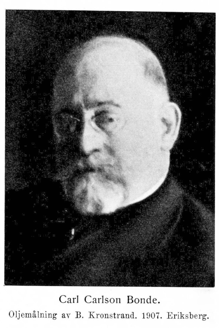 18. Carl Carlson Bonde, son till B. 15, f. 11 juni 1850 i Stockholm, d 16 nov. 1913 på Eriksberg vid makans dödsbädd. Elev vid nya elementarskolan , 1 sept. 1862; avlade mogenhetsexamen 14 maj 1869; inskriven vid Uppsala universitet 20 maj s. å.; jur. fil. kand. 14 sept. 1871) avlade kansliexamen 14 sept. 1872. Attaché vid beskickningen i Paris 25 okt. 1872; uppvaktade österrikiske ambassadören furst Metternich vid Oskar II: s kröning maj 1873; attaché i London 12 nov. s. å. och i Rom okt. 1874; tf. andre sekreterare i utrikesdepartementet 3 dec. 1875; andre sekreterare 10 mars 1876; erhöll i uppdrag att medfölja fadern på dennes särskilda beskickning till kejsaren av Tyskland och tsaren av Ryssland 23 juni s. å.; kammarherre 15 aug, s. å.; erhöll avsked ur departementet med rätt att över stat kvarstå 29 sept. s. å.; ledamot av Södermanlands läns landsting 1879 (v. ordförande 1901−03; ordförande från 1904); erhöll avsked ur kabinettet 8 dec. 1882; statsrevisor 1884, 1885, 1886 och 1891 (v. ordförande 1891); ledamot av Södermanlands läns hushållningssällskaps förvaltningsutskott 1886−99, ordförande i Oppunda hushållningsgille 1891−96 och hedersledamot av hushållningssällskapet 1900; ledamot av riksdagens andra kammare för Oppunda härad 1888−90, 1894−99 och från 1903 samt fr. o. m. 1912 för Södermanlands läns södra valkrets och var därunder bl. a. ledamot i lagutskottet 1903, i bevillningsutskottet 1904, 1905 lagt. och 1906 samt 1910, i särskilt utskott 1905 första och andra urt. samt 1907, i konstitutionsutskottet 1907−09, 1911, 1912 (ordförande), i talmanskonferensen 1909−12, v. talman 9 febr. 1912; talman 1913; uppvaktande hos kronprinsessan Lovisa av Danmark under hennes vistelse i Stockholm apr. 1891; ledamot av styrelsen för Södermanlands läns folkhögskola 1892; överceremonimästare vid hovet 3 febr. 1896; tillika introduktör för främmande sändebud 7 febr. s. å.; ledamot av kommittéerna angående omorganisation av den centrala ledningen av landets hästväsen 28 mars−18 nov. s. å. och angående uppehållande av verksamheten å K. teatrarna 25 sept. 1897−21 mars 1898; ordförande i Sveriges allmänna exportförening 1899; erhöll avsked från ceremonimästarbefattningen 12 febr. 1900; överstekammarjunkare s. d.; erhöll avsked från introduktörsbefattningen 23 febr. s. å.; ordförande i kommittén angående verksamheten vid Dramatiska teatern 11 maj 1906; inspektor och censor för samma teater; styrelseledamot i K. dramatiska teaterns a.-b. och i a.-b. dramatiska teaterbyggnadskonsortiet; sakkunnig för utredning av frågan om rikets försvarsväsen (andra beredningen) 1 dec. 1911−10 sept. 1912; erhöll avsked från överstekammarjunkarbefattningen 12 dec. 1911. Innehade som fideikommiss Eriksberg med underlydande och Forssjö bruk samt huset n:o 9 Strandvägen i Stockholm och ägde dessutom Gimmersta och Nygård i Södermanland. LLA 1883; LSkS 1884; RNO 1889; KV02kl 1894; ordförande i Svenska autografsällskapet 1895; KVO1kl 1897; ordförande i sällskapet Pro patria 1900; KNO1kl 1901; HedLHA 1908; KmstKNO s. å.; OIIsGbmt och Jmt; ledamöt av Samfundet pro fide et christianismo; innehade dessutom ett stort antal utländska ordnar och var medlem av utländska sällskap.