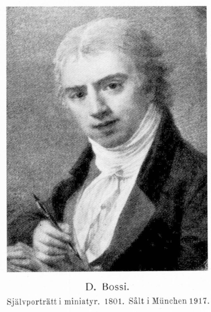 Bossi, Giovanni Domenico, f. 1767 i Triest, d 7 nov, 1853 i München. Erhöll konstnärlig utbildning i Venedig. Ägnade sig åt miniatyrmåleriet och omtalas, då han utställde i Berlin 1789, såsom »herrn Bossi aus Venedig»; förde under den följande tiden ett kringflackande liv och vistades 1794−96 i Hamburg samt befann sig 9 okt. 1796 i Petersburg, varifrån han — ovisst med vad rätt — medförde titeln »kejserlig miniatyrmålare»; kom från Ryssland till Sverige, där han gjorde sin uppvaktning hos överintendenten K. Fr. Fredenheim 9 aug. 1797 och genom daterade arbeten kan följas till år 1801; vistades sedan utomlands, förmodligen i Petersburg, men återvände till Sverige 1805 eller 1806 för att därpå i varje fall företrädesvis uppenbara sig i detta land åtminstone till år 1811; signerade 1812 ett porträtt (i konsul Hj. Wicanders samling) av G. M. Armfelt, vilken detta år vistades, i Finland och Ryssland, återfinnes i Petersburg 1813, i München och Venedig samt slutligen i Wien, där han vistades 1818 och synes ha stannat till år 1834; bodde därpå i Hamburg 1834−37 (besökte dock Italien 1836) samt i Wien 1837−41 och under sin återstående livstid i München. LFrKA 1798; ledamot av Konstakademien i Wien 1815; svensk hovmålare aug. 1824.