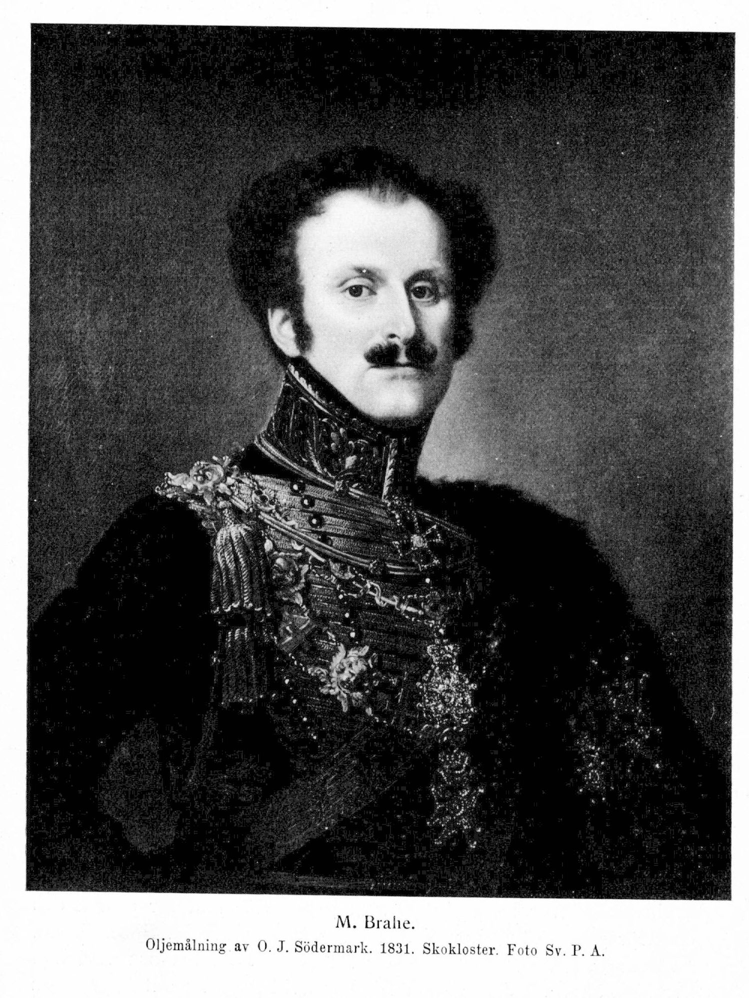 14. Magnus Brahe, den föregåendes son, f. 2 sept. 1790 på Rydboholm, d 16 sept. 1844 i Stockholm. Student i Uppsala 11 okt. 1805. Kornett vid livregementsbrigadens husarkår 14 apr. 1809; reste som ambassadkavaljer till Frankrike s. å.; kabinettskammarherre 6 aug. s. å.; kornett vid livgardet till häst 20 febr. 1810; löjtnant därstädes.10 apr. s. å.; åtföljde sin fader på dennes beskickning till Frankrike 1811; åtföljde Karl Johan till mötet i Åbo 1812 samt under tyska fälttåget 1813−14; ryttmästare i armén 17 nov. 1812; ryttmästare vid regementet 22 juni 1813; stabsryttmästare 22 maj 1814; major i armén 4 aug. s. å,; förste hovstallmästare i survivance 14 febr. 1817; skvadronchef vid livgardet till häst 4 mars s. å.; överstelöjtnant i armén 22 juli s. å. med fullmaktsdatum 4 juli; erhöll ryttmästares lön 9 dec. s. å.; förste hovstallmästare 1818; major vid livgardet till häst 19 jan. 1820; erhöll andre majors lön 24 juni s. å.; överste i armén s. d.; generaladjutant i armén 9 okt. 1821; erhöll förste majors lön vid livgardet till häst 5 febr. 1822; sekundchef därstädes 19 febr. s. å.; generalmajor 16 mars 1824; förste adjutant hos konungen och chef för konungens tjänstgörande adjutants- och ordonnansofficerskår 17 aug. s. å.; överhovstallmästare 28 febr. 1826; avgick i särskilt uppdrag till S:t Petersburg mars s. å.; tf. generaladjutant för armén 5 juli s. å.; tf. riksmarskalk 23 juli 1827; generaladjutant för armén och chef för generalstaben 21 apr. 1828; ledamot av direktionen över militära hospitalsfonden 10 sept. s. å., av kommittén angående åldern för officerarnas inträde i tjänst 17 sept. s. å. och av kommittén angående soldatens underhåll under arbetskommenderingar 15 aug. 1829−1830 (bet. ink. 21 juni); ordförande i kommittén för reglering av livgardesregementenas löner 6 febr.−21 juni 1830 och i kommittén för indelta arméns lönereglering 13 febr. 1830−30 maj 1831; ledamot av kommittén angående fördelning av anslagen till försvarsverkets iståndsättande 13 febr.−10 sept. 1830; tf. riksmarskalk 1 juni−1 okt. s. å. samt ånyo 31 maj 1831; generallöjtnant 19 juni 1830; åtföljde kronprins Oskar till S:t Petersburg s. å.; en av rikets herrar 26 jan. 1831; ordförande för arméns fullmäktige 1833−14 sept. 1839; ledamot av kommittén angående en förbättrad gevärstillverkning 23 mars 1833−20 juni 1836; ordförande i kommittén angående en allmän reglering av ackorderna inom den värvade armén 30 mars−26 apr. 1833; riksmarskalk 2 dec. 1834; tf. kansler vid krigsakademien 12 maj 1837; ledamot av Serafimerordensgillet 8 juni s. å.; ledamot av serafimerlasarettsdirektionen 11 maj 1838; avgick med lyckönskningsuppdrag till S: t Petersburg 24 juli 1839 och till Berlin 17 juni 1840; ordförande vid krigsbefälets sammankomst 1839; kansler för krigsakademien 12 okt. s. å.; ordförande i kommittén angående svenska skärgårdens befästande 25 okt.−8 dec. s. å.; hoher kirchenrat i tyska församlingen 1842; ordförande i riddarhusdirektionen 2 maj s. å.; ordförande i frimurarbarnhusdirektionen från 10 mars 1843; tf. generalbefälhavare i fjärde militärdistriktet 19 mars 1844. Erhöll guldmedalj för tapperhet i fält 1813; RSO s. å.; KSO 1822; LKrVA 1823; KmstkSO 1826; RoKavKMO 1827 (överste ombudsman 1841, överste skattmästare 1842); HedLKrVA 1828 (styresman 1829−30, 1832−33, 1835 och 1844); RCXIII:sO 1829; LSkS 1830 (ordförande 1833−44); HedLLA 1833; HedLHA 1834; HedLFrKA 1835; HedLVS 1836; LVA 1837; erhöll Karl XIV Johans porträtt i briljanter att i guldkedja bäras om halsen maj 1844; innehade dessutom ett stort antal utländska ordnar. — Ogift.