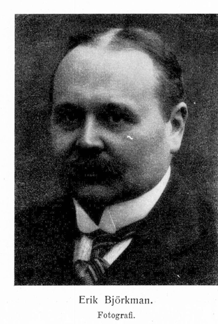 Björkman, Erik, f. 13 juni 1872 i Eskilstuna, d 10 maj 1919 vid ett tillfälligt besök på Österåsens sanatorium. Föräldrar: dv. komministern, sedermera kontraktsprosten Karl Gustav Björkman och Anna Helena Fredrika Söderberg. Genomgick tredje t. o. m. sjätte nedre klassen vid karolinska läroverket i Örebro 1883–87 och återstående klasser vid Nyköpings h. allmänna läroverk; avlade mogenhetsexamen vid sistnämnda läroverk 22 maj 1890; student i Uppsala 15 sept. s. å.; fil. kand. 14 dec. 1892; fil. lic. 25 apr. 1896; disputerade 27 maj 1896; fil. doktor 30 maj s. å.; avlade efterprövning i romanska språk i fil. kand. examen 29 maj 1897 saml, i germanska språk i fil. lic. examen 30 maj 1899; disp. i engelska språket 5 maj 1900; företog 1892–1917 ett stort antal utrikes resor, särskilt till Tyskland och England samt till Flandern i mars 1917 för studium av den flamländska språkrörelsen. E. o. amanuens vid Uppsala universitetsbibliotek 8 sept. 1894–ht. 1895; docent i engelska språket vid Uppsala universitet 16 maj 1900; lärare i engelska vid Gävle borgarskola vt. 1903; docent i germanska språk med undervisnings- och examinationsskyldighet i engelska vid Göteborgs högskola vt. 1904; e. o. professor i nyeuropeisk lingvistik med undervisnings- och examinationsskyldighet i germanska språk vid Lunds universitet 15 apr. s. å. och opterade vid denna professurs delning s. å. professuren i engelska språket; kallades till innehavare av den nyinrättade Andrew Carnegies professur i engelska språket och litteraturen vid Göteborgs högskola 15 okt. s; å., vilken kallelse av K. M:t stadfästes 2 dec. s. å.; professor i engelska språket vid Uppsala universitet 22 juni 1911. Tilldelades halva årsräntan av Oskar II:s jubelfestdonation 1901; RNO 1913; LHVS s. å.; RNS:tOO 1915.