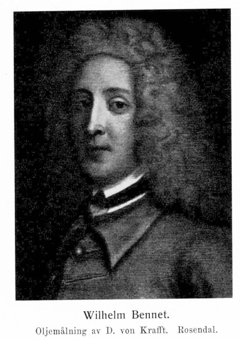 1. Wilhelm Bennet, f. enligt egen uppgift 1677 i Åbo län, d 18 nov. 1740 i Malmö. Föräldrar: majoren James Bennet och Kristina Kinnemond. Volontär vid garnisonsregementet i Riga 1693 och befordrades där till furir, förare och sergeant; kornett vid G. E. Albedyls dragonregemente 1700 (K. konfirmation 15 mars 1701); löjtnant 23 nov. 1701; regementskvartermästare 15 aug. 1703; kapten 16 maj 1704; major vid Kronobergs regemente 1709; överstelöjtnant och tjänstförrättande chef för Upplands m. fl. provinsers fyr- och femmänningsregemente till häst 2 dec. s. å.; överste där 1 aug. 1710 (K. konfirmation 30 dec. s. å.); generalmajor av kavalleriet 7 dec. 1717; friherre 2 juni 1719; landshövding i Hallands län 11 nov. 1728; landshövding i Malmöhus län och kommendant i Malmö 15 aug. 1737.