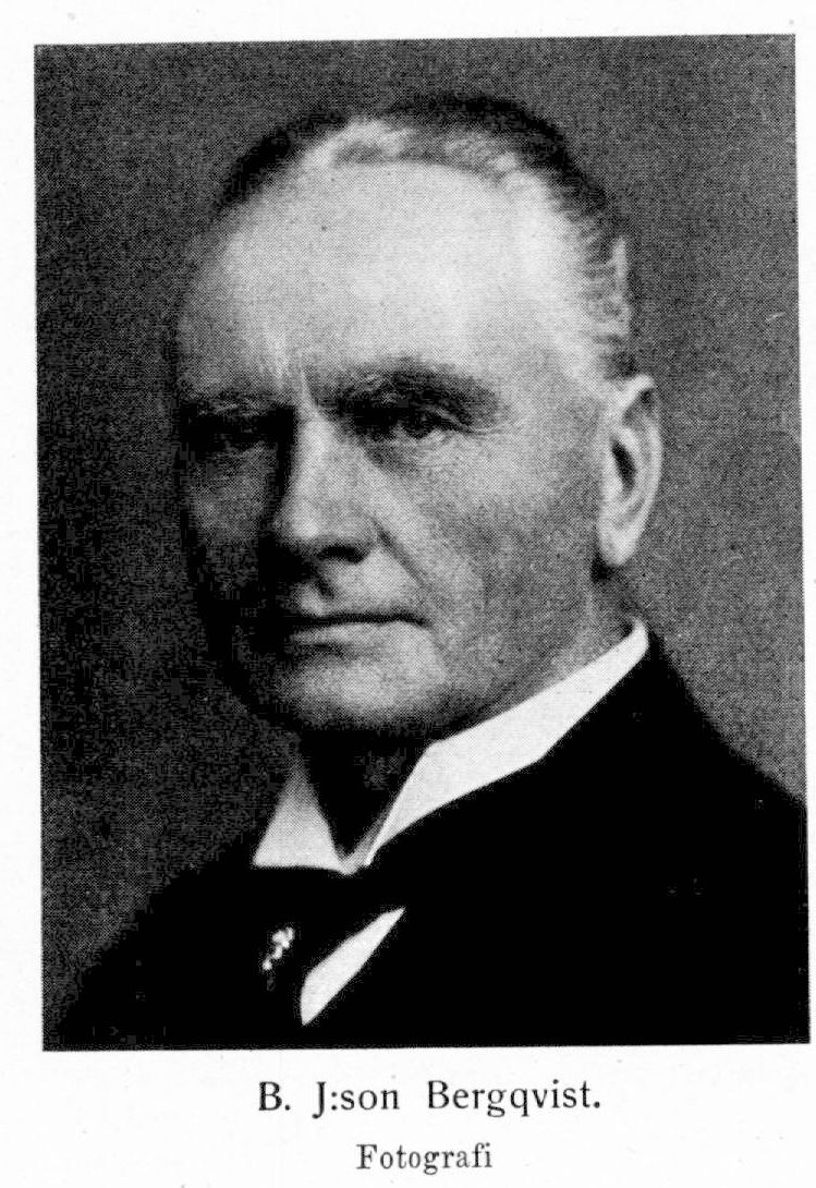 2. Bengt Jakobsson Bergqvist, f. 5 okt. 1860 i Lund. Föräldrar: kyrkoherden Jakob Otto Henrik Bengtsson Bergqvist och Olofina Morin. Lärjunge vid Lunds h. allmänna läroverk ht. 1873;. avlade mogenhetsexamen därstädes 30 maj 1879; student i Lund 5 sept. s. å.; fil. kand. 30 maj 1881; fil. lic. 15 sept. 1883; disp. 9 apr. 1884; fil. doktor 31 maj s. å.; erhöll dispens från avläggande av teologiska examina för inträde i prästämbetet 20 maj 1892; har sedan 1894, delvis med statsunderstöd, företagit ett stort antal utrikes resor. E. lärare vid Lunds h. allmänna läroverk 1881—82; vik. adjunkt vid folkskollärarseminariet i Lund ht. 1883—ht. 1884; tf. konsistorienotarie under längre och kortare tider åren 1883—97; e. o. konsistorieamanuens i Lunds domkapitel 17 okt. 1883; konsistorieamanuens 3 sept. 1884; adjunkt vid Lunds folkskollärarseminarium! 5 nov. s. å.; lärare vid Lunds privata elementarskola vt.—ht. 1888; vik. rektor vid Lunds seminarium tidvis under åren 1890 och 1891; lektor vid Lunds h. allmänna läroverk 29 apr. 1891; vik. rektor därstädes ht. 1893; föreståndare för den teoretiska prövårskursen i Lund 6 juli 1895—1899; ledamot av läroverkskommittén 4 juni 1897-—30 apr. 1898; skolrådsledamot i Lund 1897—99; rektor vid h. allmänna läroverket i Kristianstad 22 juni 1899—vt. 1904; studierektor vid elementarläroverket för flickor 1899—1904; föreståndare för småskoleseminariet och skolrådsledamot 1900—04 samt stadsfullmäktig 1901—04, allt i Kristianstad; sakkunnig för utarbetande av instruktion för läroverks-överstyrelsen och av ny läroverksstadga 27 maj—31 dec. 1904; läroverksråd och ledamot av läroverksöverstyrelsen 28 okt. s. å.; ledamot av Stockholms folkskoledirektion 1 jan. 1907 (ordförande i dess byggnadsnämnd s. d.); överdirektör och chef i läroverksöverstyrelsen 5 maj 1908; sakkunnig vid tillsättande av professur i pedagogik vid universitetet i Uppsala 1 mars 1909 liksom vid tillsättande av professur i pedagogik och psykologi vid universitetet i Lund 21 febr. 1911; ledamot av katekesnämnden 24 mars 1911 —5 okt. 1912 samt i folkundervisningskommittén för utarbetande av förslag till skolväsendets centrala ledning 13 mars 1912—2 febr. 1913; sakkunnig för utarbetande av proposition angående en skolöverstyrelse mars—dec. 1913; skolrådsledamot i Stockholm 1913—20; tf. chef för folkskolöverstyrelsen 2 nov. s. å.; överdirektör och chef för densamma 16 okt. 1914; ordförande bland sakkunniga för kompetensbestämmelser för teol. lektorer 27 maj -—31 juli 1915; inspektor för h. latinläroverket å Norrmalm 1917; ledamot av direktionen för gymnastiska centralinstitutet 30 juni s. å. (ordförande 5 mars 1919) och av direktionen för Sällskapet för nyttiga kunskapers spridande 1917; sakkunnig rörande omorganisation av skeppsgosseskolorna 24 aug.—10 dec. s. å.; ordförande bland sakkunniga rörande omläggning av upplysnings- och undervisningsverksamheten för nykterhetens främjande m. m. 30 okt. s. å.—19 okt. 1918 samt sakkunnig för utarbetande av proposition angående praktiska ungdomsskolor nov. 1917—febr. 1918; sekreterare hos riksdagens statsutskott febr.—maj 1918 vid behandling av frågan om de praktiska ungdomsskolorna; ordförande bland sakkunniga rörande vissa frågor angående praktiska ungdomsskolor och de tekniska läroverken 6 juni s. å.—30 sept. 1919; generaldirektör för skolöverstyrelsen 21 juni 1918; ordförande bland sakkunniga beträffande centrala ledningen av de till allmänna skolväsendet hörande undervisningsanstalter 26 juli—9 dec. s. å.; sakkunnig beträffande befälskurser för fänrikar vid flottan 26 sept. s. å.—28 maj 1919; ordförande bland sakkunniga rörande spridande av kunskap om könssjukdomarnas natur och smittfarlighet m. m. 25 okt. 1918—7 febr. 1919; ledamot av skolkommissionen 31 dec; 1918—16 mars 1922 (ordförande 1 nov. 1919 till statsrådsutnämningen 27 okt. 1920, varefter han ej deltagit i kommissionens arbeten); sakkunnig beträffande undervisningen i marinens korprals- och underofficersskolor 16 maj 1919 och för omorganisation av flottans skolor 1920; statsråd och chef för ecklesiastikdepartementet 27 okt. 1920—13 okt. 1921; Sveriges ombud vid skolhygieniska kongresser 1904, 1907, 1910 och 1914 samt svensk ordförande vid nordiska skolmöten 1905, 1910 och 1920. RNO 1903; KN02kl 1913; KNO1kl 1917; teol. hedersdoktor i Lund 30 sept. 1918; HedLÖS 1919; innehar dessutom flera utländska ordnar.
