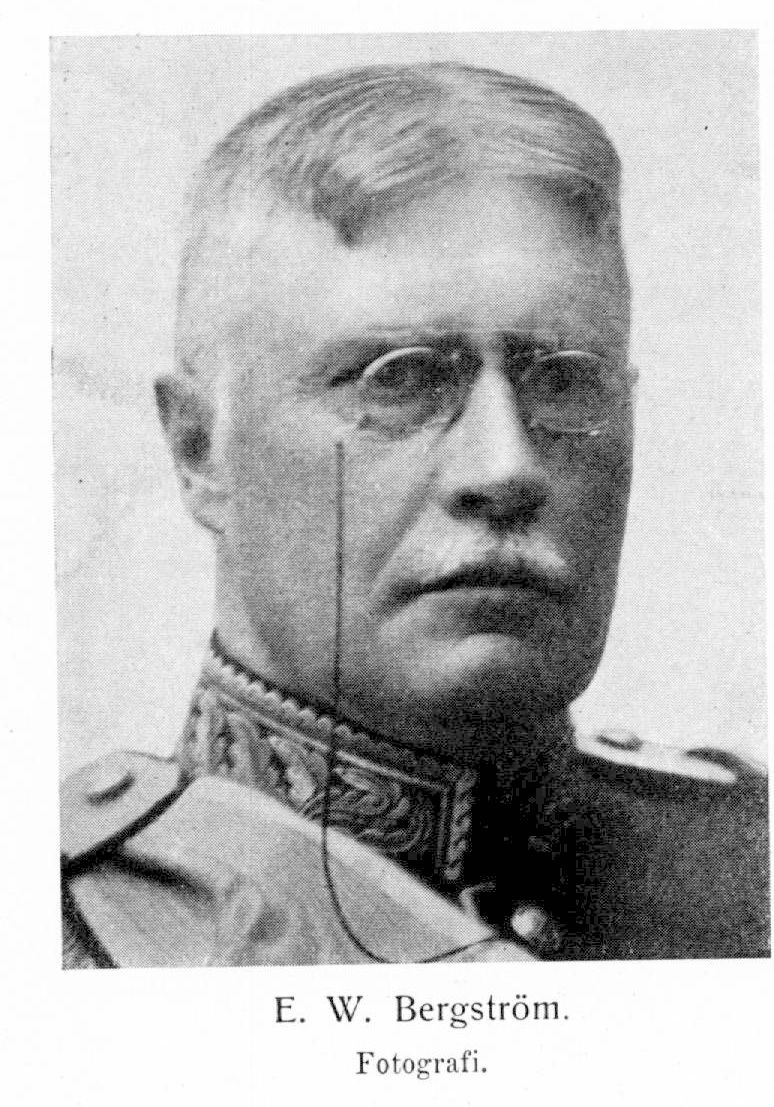 Bergström, Erik Walter, f. 5 apr. 1857 i S:t Lars församling. Föräldrar: hovrättsnotarien och lantbrukaren Svante Bergström och Anna Charlotta Juberg. Intogs i Linköpings h. allmänna läroverk 1866; avlade mogenhetsexamen därstädes 8 juni 1877; volontär vid andra livgrenadjärregementet 14 mars s. å.; avlade officersexamen 19 okt. 1878; passerade graderna vid garnisonskommendering i Karlskrona s. å.; underlöjtnant utan lön vid ovannämnda regemente 15 nov. s. å.; transporterad till underlöjtnant vid Gottlands nationalbeväring 3 jan. 1879; v. adjunkt vid Linköpings h. allmänna läroverk 1 mars s. å. —maj 1880; elev vid krigshögskolan 1880—82; deltog i Svea artilleriregementes vapenövningar 1881; aspirant vid generalstaben under två och ett halvt år från 1 okt. 1882 och var därunder bl. a. kommenderad vid lantförsvarsdepartementets kommandoexpedition 1 jan.—15 apr. 1884 samt vid Kronprinsens husarregemente 15 apr. —1 juli s. å.; har deltagit i ett stort antal fält- och fälttjänstövningar, såsom i generalstabens fältövningar 1883, 1886, 1889, 1890, 1897 och 1901, i fälttjänstövningarna i Skåne 1889 liksom i utarbetandet av den över desamma avgivna berättelsen samt i vinterfältövningarna i Norrbotten 1918; löjtnant vid Gottlands nationalbeväring 10 juli 1884; tjänstgjorde vid generalstabens topografiska avdelning 1 okt. 1885 till vapenövningarnas början 1886; stabsadjutant och löjtnant vid generalstaben 12 mars 1886; tjänstgjorde med vissa avbrott för trupptjänstgöring (bl. a. vid andra livgardet 1 nov. 1887—30 sept. 1888 samt vid första livgrenadjärregementet under beväringsrekrytskola och regementsmöte med försöksmobilisering 1900) vid generalstabens huvudstation 1886 —1900; lärare vid artilleri- och ingenjörhögskolan 15 juli 1888 —1895; stabsadjutant och kapten i generalstaben 11 sept. 1891; kapten i Gottlands infanteriregemente 7 aug. 1896; lärare vid krigshögskolan 1 apr. 1898—30 juni 1899; överadjutant och major i generalstaben 8 juli 1898; stabschef vid tredje arméfördelningen 28 sept. 1900; åtföljde såsom föredragande i kommandoärenden konungen till Norge 29 mars—19 apr. 1901; överstelöjtnant vid Kalmar regemente 7 mars 1902; kommenderad till fältartilleriets skjutskola 1903 och 1905; överste och chef för Västgöta regemente 1 juli 1904; bevistade krigsbefälets sammanträden 1905, 1907 och 1908; ledamot av kasernförläggningskommittén inom tredje arméfördelningen 1906; stadsfullmäktig i Skövde s. å.; lärare vid taktiska utbildningskurser för kaptener (ryttmästare) 1909, 1910 och 1911; militärbefälhavare på Gottland och överste i Gott-lands infanteriregemente samt generalmajor i armén 25 juni 1912; chef för trettonde självständiga infanteribrigaden under fälttjänst-övningarna i Västergötland 30 sept—5 okt. s. å.; kommenderad vid fästnings- och positionsartilleriets skjutskola juli 1913; militärbefälhavare över Gottlands mobiliserade stridskrafter 2 aug. 1914 —31 dec. 1916; generalmajor och chef för fjärde arméfördelningen 1 jan. 1917; generallöjtnant och inspektör för infanteriet 14 juli 1919; arméchef vid arméfältövningarna 1919 och vid fälttjänst-övningarna i Södermanland 1920; erhöll avsked 4 apr. 1922. RSO 1899; LKrVA 1900; KSO2kl 1907; KSO1kl 1912; GV:sOIM s. å.; KmstkSO 1919; innehar dessutom utländska ordnar.