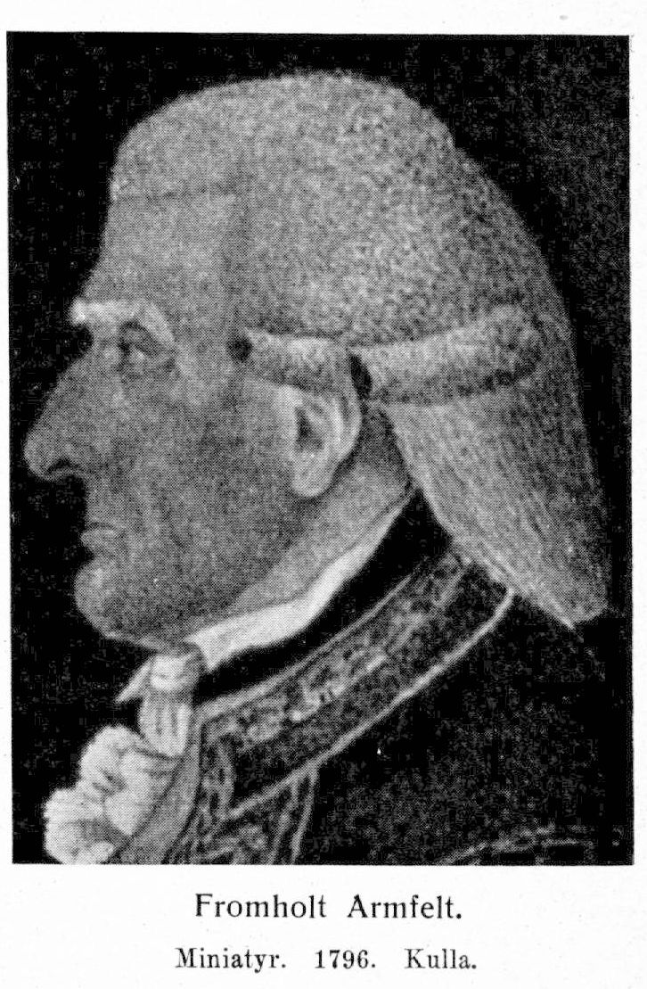 2. Fromholt Armfelt, den föregåendes son, f. våren 1721 i Gävle, d 11 juni 1797 i Stralsund. Lärfyrverkare 6 dec. 1735; lärkonstapel 6 apr. 1736, furir 20 maj 1738, sergeant 20 maj 1740, underlöjtnant 4 dec. 1741 genom general en chef Lewenhaupts fullmakt, allt vid artilleriets finska bataljon; deltog i kriget mot Ryssland sistnämnda och följande år; kommenderad mot dalkarlarna 1743; löjtnant 19 aug. s.-å.; gick i fransk tjänst 1744; kapten vid marskalkens av Sachsen dragonregemente; bevistade bl. a. belägringarna av Tournay och Ath 1745 samt deltog i slaget vid Fontenöy och en del smärre strider; kapten efter återkomsten till Sverige 23 apr. 1747; kommenderad till Tyskland vid det pommerska krigets utbrott 1757; tygmästare vid artilleriet 25 apr. 1758; kommenderad att följa ryska armén maj s. å. samt, sedan han därifrån rappellerats efter slaget vid Zorndorf, österrikiska armén; transporterad till major 31 dec. s. å.; erhöll överstelöjtnants titel 23 juni 1762 och överstes titel 6 juni 1763; överstelöjtnant vid artilleriet på Gottland 16 aug. s. å.; transporterades till den i Stralsund förlagda avdelningen av artilleriet 26 juni 1764; generalmajor 9 mars 1775; generallöjtnant 1 sept. 1782; tilldelades vid artilleriets delning 1794 Vendes artilleriregemente men blev samtidigt tjänstefri. RSO 1748; KSO 1778.