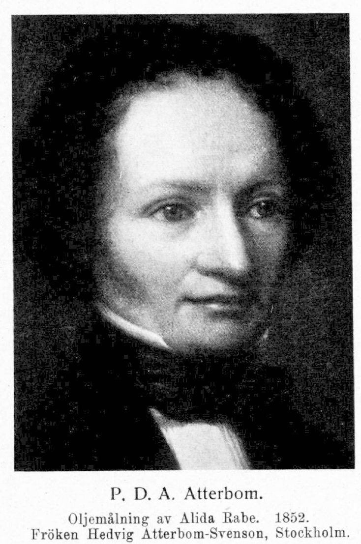 Atterbom, Per Daniel Amadeus, f. 19 jan. 1790 i Åsbo socken, d 21 juli 1855 i Stockholm. Föräldrar: komministern i Åsbo Gabriel Atterbom och Hedvig Kristina Kernell, dotter till socknens prost. Elev vid Linköpings lärdomsskola 1799; student i Uppsala 1 okt. 1805; disp. 15 juni 1807 (Prima Iliadis Homerica rhapsodia Sivethice reddita, p. I, pres. J. Tranér); fil. kand. 8 mars 1815; disp. pro gradu 13 juni s. å.; fil. magister 15 juni s. å.; företog resor i Tyskland och Italien juni 1817–19 och till Köpenhamn och Sorö 1825. Kronprins Oskars lärare i tyska språket och litteraturen 1819–21; docent i allmän historia 10 maj 1821; adjunkt i teoretisk och praktisk filosofi 1 febr. 1824; uppförd på förslag till professuren i praktisk filosofi 26 sept. 1827; professor i teoretisk filosofi 8 okt. 1828; professor i estetik 28 okt. 1835; rector magnificus hösten 1837. LVVS 1819; RNO 1837; en av de 18 i Sv. akad. 1839; LHA 1853; var dessutom ledamot av lärda och vittra utländska samfund samt innehade en dansk orden.