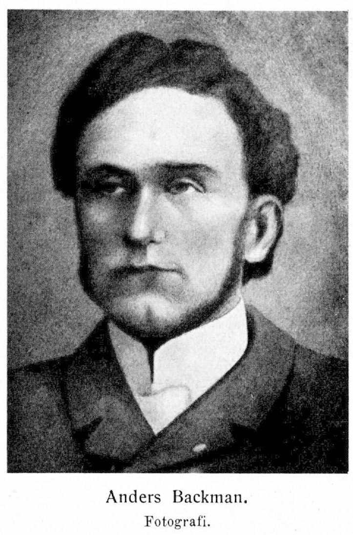 Backman, Anders, f. 22 juni 1858 i byn Önsta i Oviken. Föräldrar: odalstorparen och soldaten Olof Backman och Kerstin Hägglund. Avflyttade från Oviken till grannsocknen Myssjö 1872, där fadern köpt ett större torp, och erhöll där folkskoleundervisning 1873; genomgick den fyra månader långa kursen i länets småskoleseminarium 1875 och avlade avgångsexamen 20 maj s. å. Småskolelärare i ambulerande småskolan i östra Myssjö 1875–83; lärare vid baptistförsamlingens vardagsskola i västra Myssjö 1883–85; baptistpredikant från 1886; reste i denna egenskap i Jämtland och Härjedalen, bl. a. som lappmissionär, samt verkade även i Blekinge; köpte 1889 gården Backen i Kövra i Myssjö; har vid sidan av arbetet som resepredikant, vilket dock med åren och särskilt efter hans andra giftermål inskränkts, och vid sidan av jordbruket verkat tidvis som predikant i baptistförsamlingen i Myssjö och såsom dess pastor från 1904 samt som färdledare för turister och skriftställare.