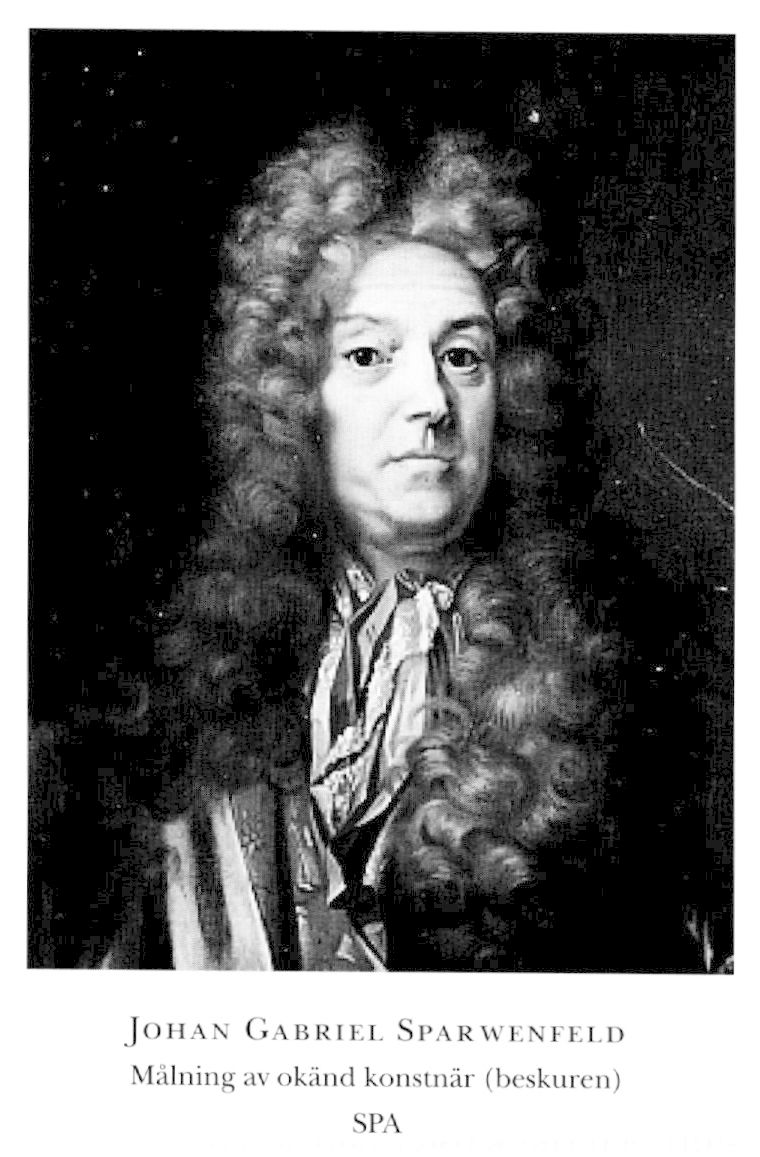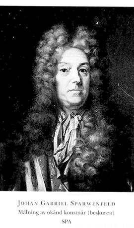 Sparwenfeld, Johan Gabriel, f 17 juli 1655 (v Schantz geneaker, RHA) i Åmål (Åker-steins geneaker, RHA), d 2 juni 1727 (v Schantz) i Romfartuna, Vm (Åkerstein; ej i db). Föräldrar: översten Johan Gabrielsson S o Christina Uggla. Inskr vid UU 20 juni 63, vistades utomlands våren 77-april 82, deltog i en sv beskickn till Moskva febr-juni 84, studerade i Moskva juni 84-juni 87, företog forskn:resa i Europa o Nordafrika april 89 (K M:ts instruktion 3 aug 88 o pass 3 april 89)-maj 94, underceremonimästare vid k hovet 4 april 95, överceremonimästare där 18 nov 01-12.