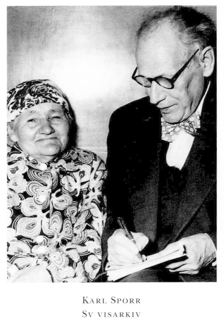Upptecknat: [Uppteckningar] (K-E Forsslund, Med Dalälven från källorna till havet. Sthlm: Åhlén & Åkerlund, 1919-1939. 3 d i 27 böcker. [Det finns uppskattningsvis minst 300 uppteckningar av K S i detta verk.] - [Uppteckning av] Bingsjöpolska. Efter H A Olson (Folkdansringen, årg 1, 1921, nr 9 [dvs 10], s 7). - [Uppteckningar] (Svenska låtar. Dalarna, H 3, Sthlm: Norstedt, 1924, s 134-145; H 4, 1926, s 149-157). - Vinteren tar ända. Folkvisa från Dala-Järna (Arr A Bond). Sthlm 1944. - Och jungfrun hon gångar på högan berg. Folkvisa från Dala-Järna (Arr A Bond). Sthlm 1945. - Det gångar två jungfrur åt ro-sendelund. Folkvisa från Dala-Järna (Arr A Bond). Sthlm 1945. - Där växte upp en lilja. Folkvisa från Dala-Järna (Arr A Bond). Sthlm 1945. -Jag var ej mer än sexton år. Folkvisa från Dala-Järna (Air A Bond). Sthlm 1945. - Med ängslan och besvär. Folkvisa från Dala-Järna (Arr A Bond). Sthlm 1945. - Du har låtit din kärlek få försvinna. Folkvisa från Dala-Järna (Arr A Bond). Sthlm 1945. - Bereden väg för Herran (Sv. ps. 43: 1, 2). Melodi enligt gammal tradidon i Boda (Arr A Bond). Sthlm 1948. - Säg mig den vägen, som drager till livet. Melodi från Skattungbyn (Arr A Bond). Sthlm 1948. - O vad sällhet. Melodi från Skattungbyn. Tradition: A Dunell (B Granstam, Meditationer över gamla dalamelodier. För orgel. H 10, Från Malung och Skattungbyn, Klockrike 1981, s [3]). -Karl Sporrs uppteckningar (H A Olsson, Hjort Anders Olssons låtar, Upptecknade av N Andersson, O Andersson och K S. Utg av G Ternhag, Hedemora: Gidlund, 1993, s 87-138, Rapport, Dalarnas forskningsråd, 1993:5). - Med notbok genom Gagnef. KS:s uppteckningar från Gagnefs socken. D 1-3. Dala-Flo-da: Arnberg & Flodin Musik, 1997-2000. - Leksands sockenbeskrivning. D 11, Folkmusik i Leksand, Djura och Siljansnäs. Uppteckningar av K S 1916-47. In-ledn o kommentarer av M Ramsten. Utg av Leksands kommuns kulturförvaltning i samarbete med Svenskt visarkiv. Leksand 1999. 350 s, musiknoter.