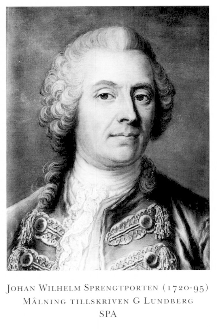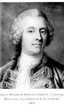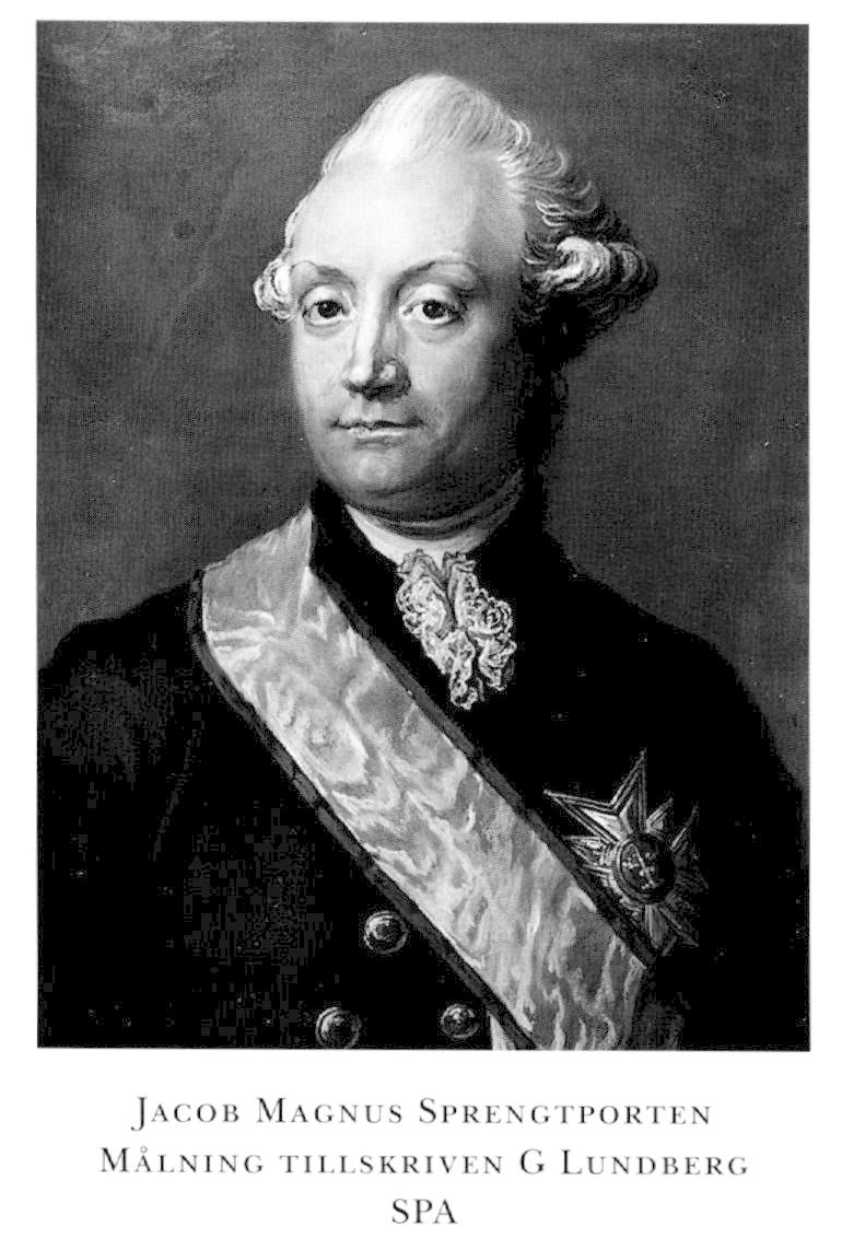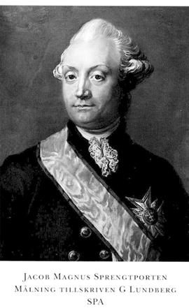 1 Sprengtporten (före 1766 Sprengtport), Jacob Magnus, f 10 nov 1727 (egen uppg i E 5604, RA) i Borgå landsförs, Nylands län, d 2 april 1786 i Sthlm, Hedv El. Föräldrar: majoren Magnus Wilhelm Sprengtport o Anna Margareta Amnorin. Volontär vid Fortifikationen 25 juni 39, underofficer vid Livg 43, korpral vid Nylands dra-gonreg 44, förare vid Livg 46-51, tjänstg vid fästmverken i Tavastehus 47 o Hfors 48-50, fortifikationsofficer vid K M:ts resa till Finland 50, tjänstg vid kungens särsk fortifikationskontor 50-56, informationsadjutant vid Livg 11 okt 51, deltog i riksdagarna 51/52-71/72 (led av land- o sjö-militärdeput 65/66, av SU 69/70 o 71/ 72), fänrik vid Livg 20 aug 53, bitr ingen- jörkapten vid Fortifikationen 5 dec 55, ord 6 maj 57, ingenjörkapten vid Livg 6 maj 57-21 jan 62, överadjutant hos general-löjtn A Fersen (bd 15) 57, deltog i pommerska kriget 57-62, major i armén 7 dec 59, chef för Sprengtportens frikår 61-62, överstelöjtn i armén 18 dec 61, vid Gula husarreg 23 juni 62, led av komm ang fästn:verken i Finland april 66-nov 67, frih 6 nov 66 (introd 76), överstelöjtn vid Liv-dragonreg 3 juni 67, överste för Nylands o Tavastehus läns dragonreg jämte Karelska skvadronen 10 aug 69-22 sept 72, chef för Finska lätta dragonkåren 20 febr 70, gene-rallöjtn 12 sept 72, överste för Livg o Lätta dragonerna av Livg 22 sept 72-10 mars 74. - Serafimerriddare 23 nov 78. - Ogift.