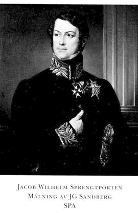 3 Sprengtporten, Jacob Wilhelm, brorson till S 1 och S 2, f 9 okt 1794 i Hyltinge, Söd, d 29 sept 1875 där. Föräldrar: ambassadören o generalen, frih Johan Wilhelm S (s 62) o grev Sophia Lovisa Mörner. Inskr vid UU 29 sept 09, ex till rättegångsverken där 30 maj 11, auskultant i Svea hovrätt 21 juni 11, kornett vid Livg till häst 4 febr 12, ofh-cersex maj 12, deltog i fälttågen i Tyskland o Norge 13-14, löjtn vid Livg till häst 22 maj 14, adjutant o attaché hos greve C A Löwenhielm (bd 24) i S:t Petersburg sept 16-maj 17, stabsryttmästare vid Livg till häst 3 febr 18, ryttmästare 12 maj 22, major där 6 maj 23, deltog i riksdagarna 23-65/66 (led av allm besvärs- o ekonomi-utsk 28/30, av statsutsk 40/41), överste-löjtn i armén 1 dec 24, överstekammarjun-kare 26 juni 25, överhovjägmästare 4 juli 27-15 maj 38, ordf i komm ang skogs-hushållmen o jaktväsendet mars-nov 28, överste i armén 21 april 28, chef för Skogs-inst 15 okt 28-25 maj 38, led av komm ang tullen på spannmål okt 29-jan 30, avsked från reg o generaladjutant i generalstaben 22 april 30, överståth i Sthlm 7 okt 30-30 juni 38 o 28 dec 44-26 juni 48, ordf i Sv jägarförb 30-39 o 45-46, ordf i komm ang åtgärder mot kolerans inbrott juni-juli 31, ordf i Sv trädgårdsfören 22 okt 32, led av Nord fornskriftsällsk 7 nov 33, generalmajor i armén 28 jan 34, led av Sv fornskriftsällsk 31 mars 45, ordf i komm ang socken-stämmoförordn för Sthlms stad okt 45-okt 46, i dir för Sv slöjdfören 45-48, led av be-skickn till Khvn juni 48, generalmönster-herre 24 april 56, led av beskickn till Paris 31 jan 58, generallöjtn i armén 23 mars 58-17 nov 63, led av Södermanlands läns landsting 63-70 o 72-74, ordf i komm för uppresande av Carl XII:s staty i Sthlm 66-68, led av FK 67-74 (led av tillf utsk 68 o 73, ålderspresident 67-74). - LKrVA 27, HedLKrVA 34, HedLLA 37, HedLFrKA 45, LYA 48, serafimerriddare 28 april 49, led av ett flertal uti lärda sällsk.