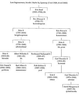 I äktenskap med kyrkoherdedöttrarna Justina Elisabeth Bozaea och Anna Catharina Sundia hade S tio barn. Ett av dessa var sonen Pehr S (1737–1818), som inskrevs vid UU 1756 och avlade bergsexamen där 1761. Auskultant i Bergskollegium s å blev han geschworner i Sala bergslag 1766 och var bergshauptman där 1788–1817. Bergmästares titel erhöll han 1777. S blev stamfar för den äldre grenen av släkten S.