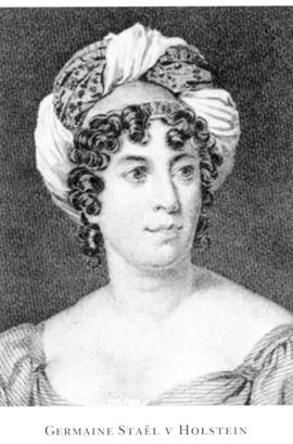 S mottogs varhelst hon kom som en europeisk celebritet. Hon var redan då en berömd författarinna. I sitt första betydande verk, De la littérature considérée dans ses rapports avec les institutions sociales (1800), skisserade hon den mänskliga kulturens utveckling från Homeros till den franska revolutionen. Verket präglas av den framstegsoptimism som var encyklo-pedifilosofernas kännemärke, men även av att S framhäver kvinnornas betydelse för litteraturens utveckling. Med De 1'Alle-magne introducerade hon den samtida tyska litteraturen för fransk publik. Arbetet var resultatet av vistelser i Weimar, Berlin och Munchen, där hon träffade de ledande tyska författarna och filosoferna. Det förelåg i manuskript 1810 men utgivningen stoppades av den franska censuren och det utkom först 1813 i London. Un- der tiden mellan de kulturhistoriska verken författade S brevromanen Delphine (1802), där hjältinnan är ett föryngrat och förskönat idealporträtt av henne själv, och Corinne ou lTtalie (1807), en roman om kvinnors villkor i ett samhälle fyllt av fördomar, men också en resebok om Italien, dess konst, byggnader och folkliv.