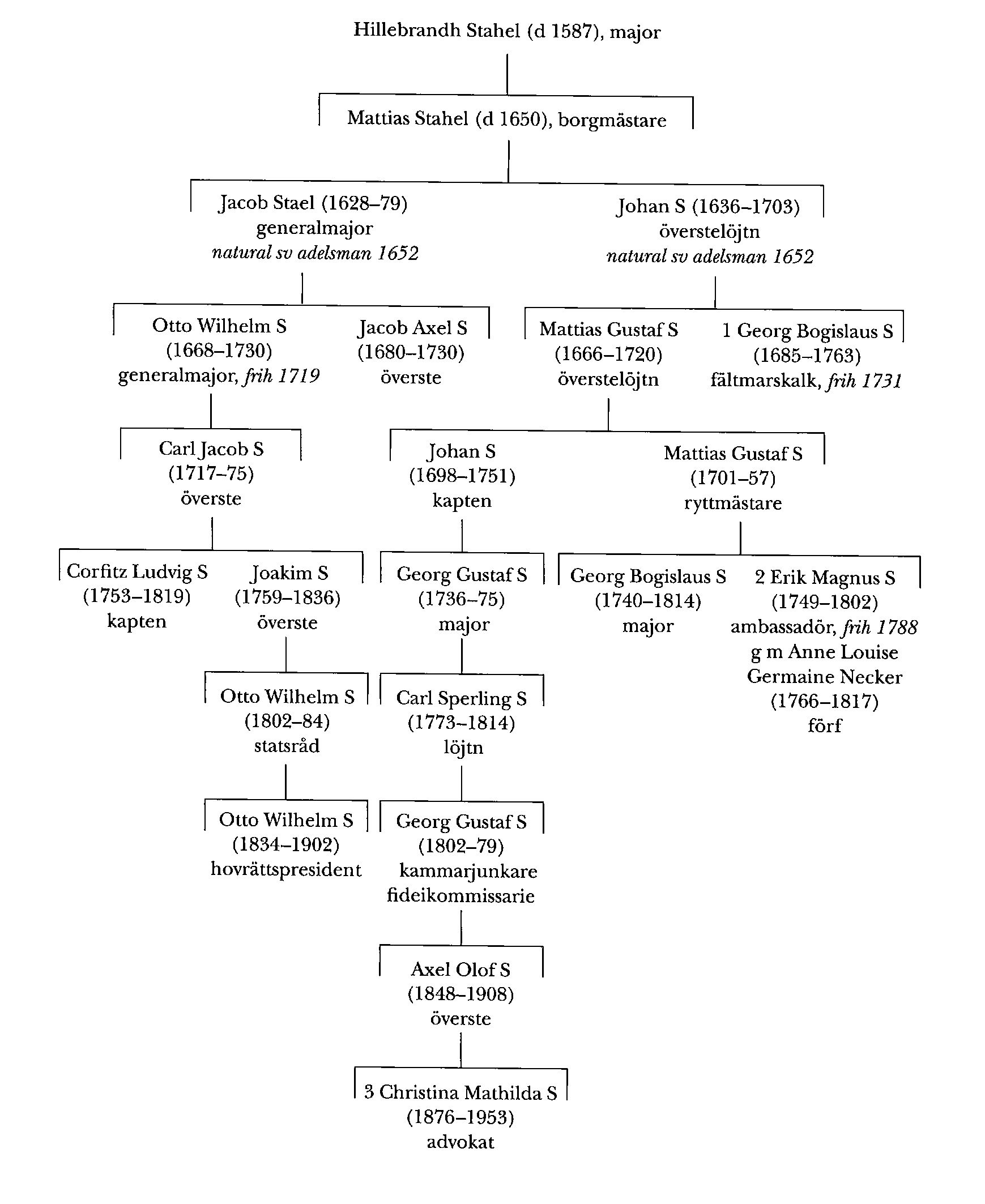 Som stamfar för den sv grenen räknas Hillebrandh Stahel (d 1587) som var major i polsk tjänst. En son till honom var borgmästaren i Pernau (Pärnu) i Estland Mattias Stahel (d 1650), vars söner jämte deras kusiner blev av drottning Kristina 1652 na-turaliserade sv adelsmän (introd 1675). Sonen Jacob Stael (1628-79) fick efter studier i matematik och mekanik 1649 ett resestipendium för tre års utrikes studier, och efter hemkomsten tog han tjänst i artilleriet men övergick sedan till infanteriet och blev överstelöjtnant vid Upplands regemente. Han deltog i krigen mot Polen och Danmark 1654-60, där han blev kommendant i Köge 1658; tillsammans med Erik Dahlbergh (bd 10) utarbetade han planer till stadens befästande och var verksam med detta till krigets slut. S utnämndes 1660 till överste för artilleriet i Livland, Estland och Ingermanland samt på Ösel, vilket även innebar att han skulle ha tillsyn över befästningarna - senare titulerades han även direktor över fortifikationsväsendet där och generalkvartermästare - och det var huvudsakligen i Östersjöprovinserna han under återstoden av sin levnad var verksam.