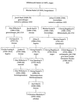 Brorson till Jacob Stael var Georg Bogis-laus S (S 1). Dennes brors sonson GeorgBo-gislaus S (1740-1814) tjänstgjorde inom artilleriet och deltog i pommerska kriget samt blev major och överstallmästare vid artilleriet i Sthlm. Han bevistade riksdagarna 1765/66-92 och 1809/10 samt tillhörde de mot Gustav III oppositionella. Vid riksdagen i Gävle 1792 var S en av de mera framträdande inom adeln och hade ett nära samröre med C F Pechlin (bd 28) och ingick i dennes "motståndsrörelse". Han förefaller således ha varit helt införstådd med sammansvärjningen mot kungen. S arresterades också efter mordet och satt i fängsligt förvar i en vecka innan han släpptes. Han var ledamot av riksgäldsfullmäktige 1789-95 och 1797-1800 och karakteriseras även i denna befattning som "klar oppositionsman inte utan rakryggad beslutsamhet" (Dahlström, s 274). Han var energisk och uppslagsrik men suspenderades från befattningen 1800 sedan det visat sig att han och en kollega lånat betydande belopp ur riksgäldsmedlen. Christina Mathilda S (S 3) var kusins sonsons sondotter till honom.