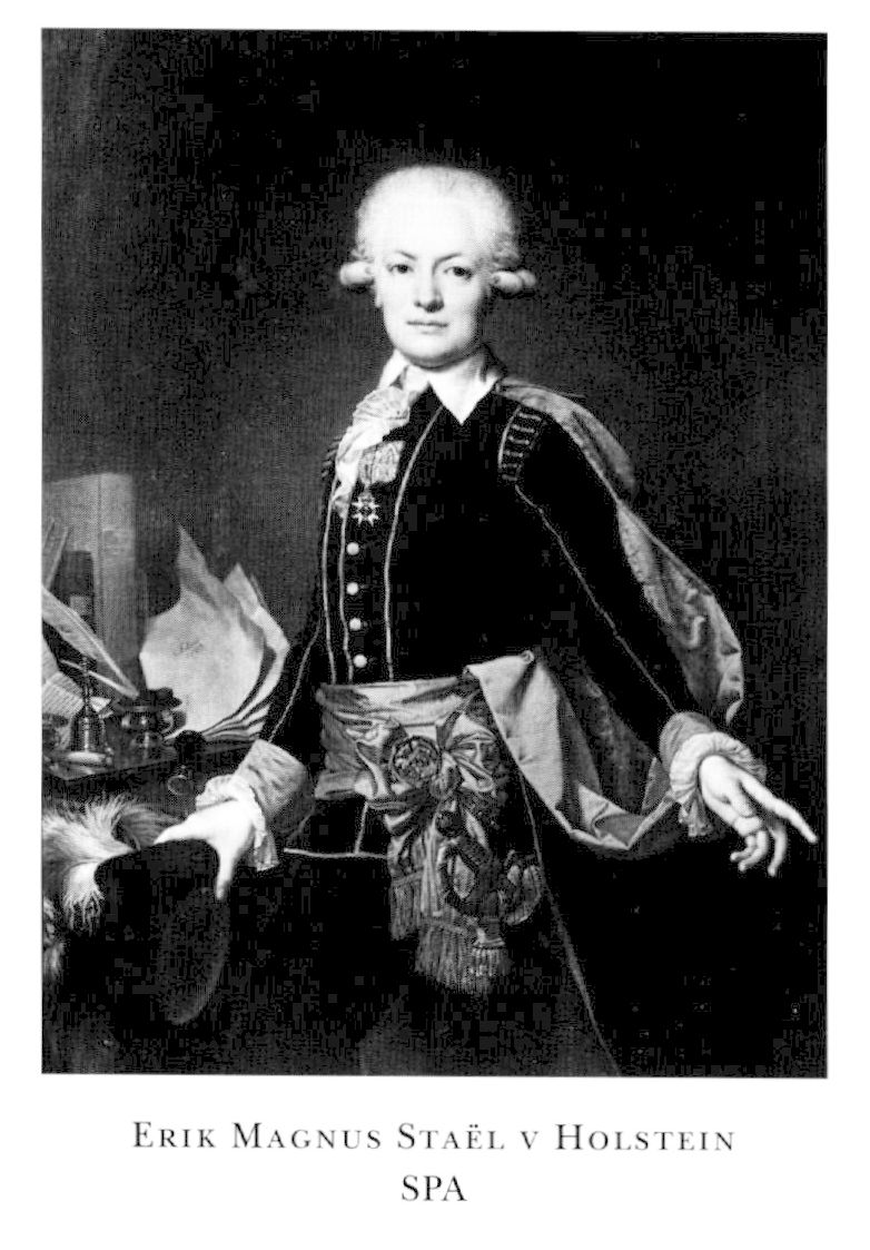 2 Staël von Holstein, Erik Magnus, halvbrors sonson till S 1, f 25 okt 1749 i Kvillinge, Ög, d 9 maj 1802 i Poligny, Jura, Frankrike. Föräldrar: ryttmästaren Mattias Gustaf S o Elisabet Ulfsparre. Volontär vid Östgöta infanterireg 62, sergeant 14 okt 63, sergeant utan lön 17 aug 67, stabsfänrik 18 mars 68, allt vid Östgöta infanterireg, löjtn i armén 13 sept 72, vid Södermanlands reg 3 mars 73, stabslöjtn 29 april 78, stabskapten där 15 mars 80-8 okt 92, kammarherre hos drottn Sophia Magdalena 21 febr 77-95, attaché i Paris 78, chargé d'affaires där maj 83, ministre plenipotentiaire 31 juli 83, ambassadör 24 nov 83-febr 92 o 25 febr-nov 93, allt i Paris, frih 24 jan 88, ambassadör till Khvn med särskilt uppdrag 26 febr-27 mars 94, åter ambassadör i Paris 23 febr 95-aug 96, commissionaire plenipotentiaire i Paris 20 febr 98, ministre plenipotentiaire där 4 april 98-13 juli 99.
