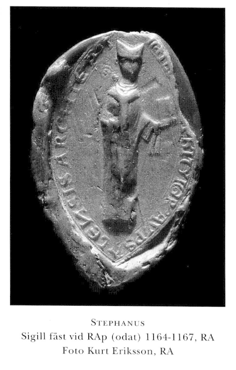 Stephanus, d 18 juli 1185, begr i kapitelsalen i Alvastra kloster (SRS, Paulsson). Munk i cisterciensklostret Alvastra, vald biskop i Uppsala, vigd ärkebiskop senast 5 aug 1164 i Sens, Frankrike.