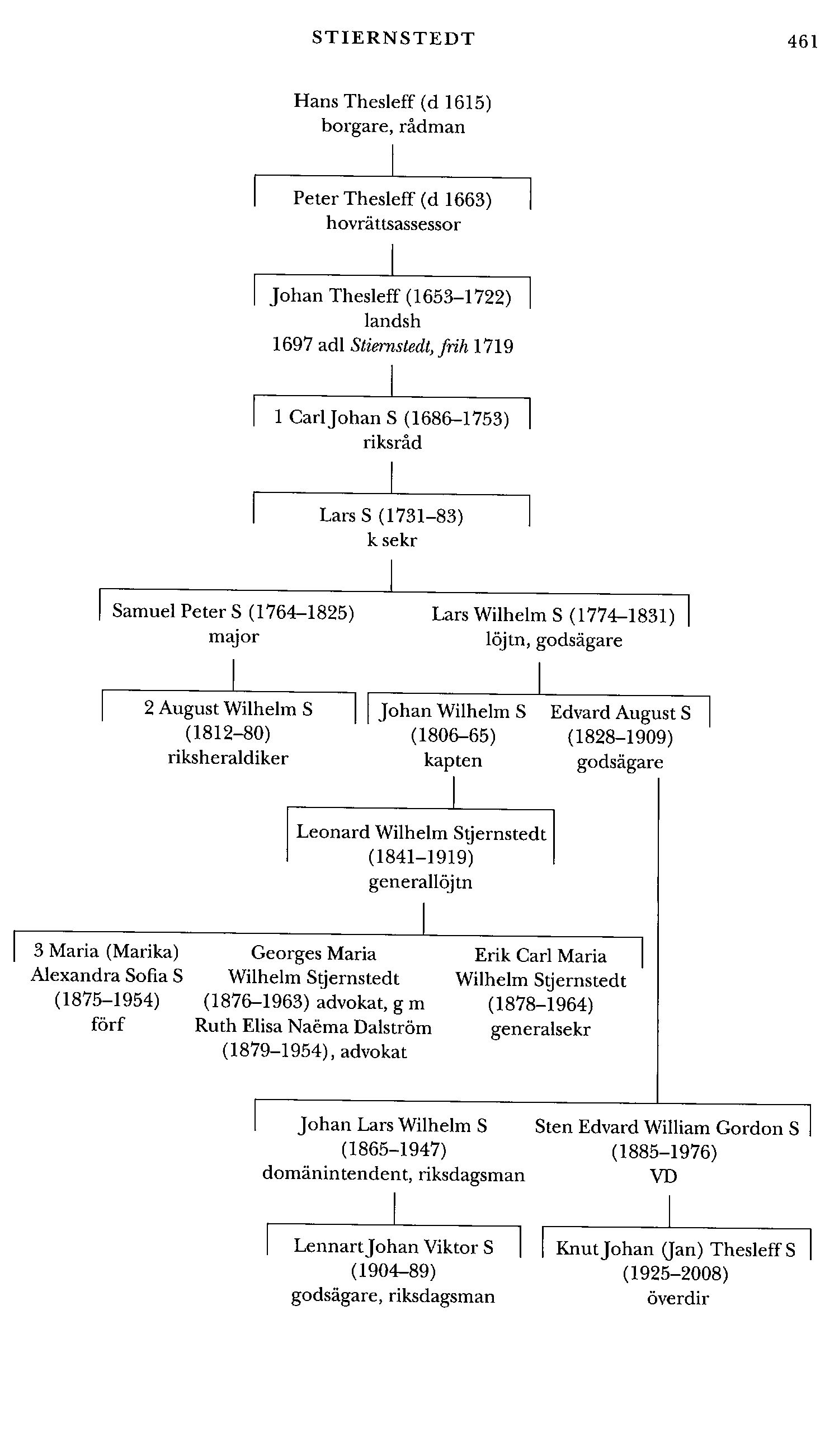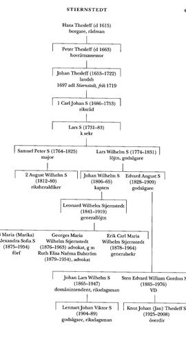 Stiernstedt (Stjernstedf), släkt, vars äldste kände stamfar var HansThesleff (d 1615), rådman i Viborg och troligen av tyskt ursprung. Dennes sonson Johan Thesleff (1653-1722) adlades 1697 med namnet Stiernstedt, sedan han själv uppvaktat Karl XII i ärendet. Son till en jurist, fadern hade varit justitieborgmästare i Hfors och 1650 utnämnts till assessor i Åbo hovrätt, slog även Johan S in på den juridiska banan. Efter studier vid Åbo akademi antogs han 1670 till auskultant vid hovrätten, blev aktuarie där 1675 för att sedan göra en snabb karriär som civilämbetsman. Häradshövding i Viborgs län 1680 blev han guvernementssekreterare i Narva 1691 och justitieborgmästare där 1699.1 denna egenskap fick S uppleva stadens belägring 1700, varunder hans nyuppförda hus ödelades. Utnämnd till lagman i Söderfinne lagsaga 1703 undkom han dock Narvas fall följande år, då hans bägge döttrar togs till fånga. Efter flera förordnanden som landshövding under svåra krigsförhållanden blev S 1714 ordinarie innehavare av detta ämbete i Åbo län, men nödgades redan s å fly till Åland och sedan vidare till Sthlm. Därifrån skötte han förvaltningen av den åländska skärgården, den enda del av hans hövdingadöme som ej besatts av ryska trupper, och kunde inte fullt ut återta sin position förrän efter freden i Nystad 1721. Han avled dock redan i febr följande år, kort efter sin återkomst till Åbo.