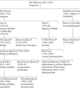 Källor o litt: Allmänt: N Björkenstam, Bergsmän o hyttor på Värmlandsberg (1967); Norrköpings stadsbibl:s o museums handl:ar, 1 (1920) o 4 (1938); Norrköpings hist, 4 (1968) o 5 (1972); E Ringborg, Till Norrköpingskrönikan, 2–4 (1920–21) o 6 (1923); SMoK; B Swartz, Familjen o snuset: om släkten S som byggde Norrköping (2008); Sv släktkal 1943 (1942).