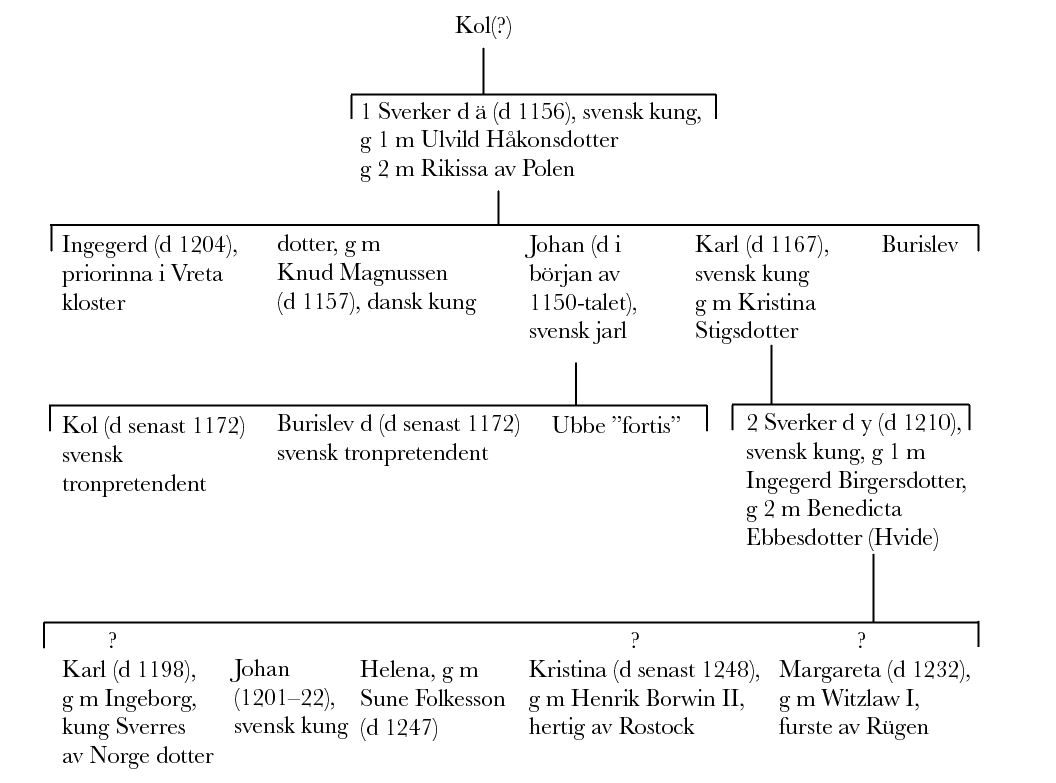 Kol blev far till kung Sverker den äldre (se nedan) och med honom står ättens genealogi på mera säker mark. Döttrar till honom var Ingegerd (d 1204), under 40 år priorinna i Vreta kloster, och en till namnet okänd kvinna som gifte sig med danske kungen Knut Magnussen, dödad 1157. Sverkers son Johan (Jon jarl, bd 20) blev far till Kol (bd 21) och Burislev samt en i övrigt okänd Ubbe ”fortis” (den starke).