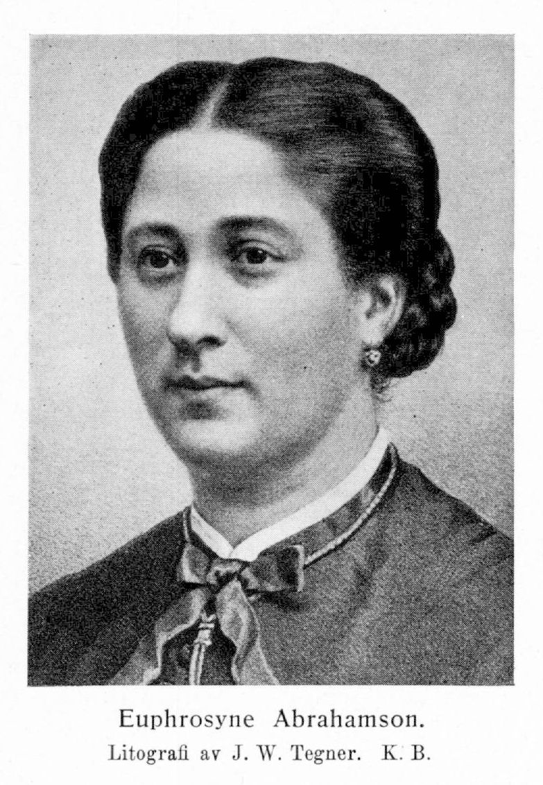 Fru A. var i Göteborg synnerligen uppburen som sångerska och avhållen som personlighet.. I egenskap av en förmögen mans hustru utövade hon även en omfattande välgörenhet; på makarnas egendom Vänhem utanför staden upprättade hon en liten slöjdskola för traktens barn, vilket torde hava givit idén till den slöjdskola i stor stil, som hennes make sedermera upprättade å sin egendom Nääs. Till hugfästande av hennes minne överlämnade han några månader efter hennes död till musikaliska akademin en donation — under namn av »Fru Euphrosyne Abrahamsons gåvofond» — å 25,000 kr., varav räntan skulle utgå till en eller flera av musikkonservatoriets sångelever, och genom vilken »välgörande konststiftelse» testator ville, såsom det heter i donationsbrevet, »giva ett sant uttryck både åt andan av hennes sköna konst och åt böjelserna hos hennes ädla hjärta».
