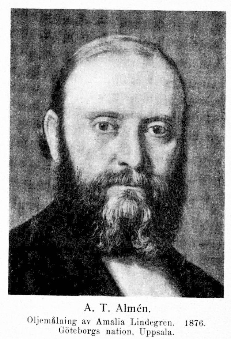 1. August Theodor Almén, f. 24 jan. 1833 i Myckleby prästgård, d 24 nov. 1903. Föräldrar: prosten Johan Andersson och Karolina Elisabet Lignell. Student i Uppsala 24 sept. 1852; avlade med. fil. examen 28 okt. 1854; inskriven i med. fakulteten 19 nov. 1856; med. kand. 27 febr. 1858; med. lic. 14 sept. 1859; disp. 9 maj 1860; med. doktor 1 juni s. å.; företog med Sederholms stipendium för den fysiologiska kemins studium en utrikes resa, förnämligast till Zürich, 15 maj–okt. s. å. Extra bataljonsläkare vid Jämtlands hästjägarkår 6 mars 1856; biträdande läkare vid sjukvården inom Göteborgs län 21 sept. 1857; amanuens vid laboratoriet för medicinsk och fysiologisk kemi vid Uppsala universitet ht. 1858 och vt. 1859; förordnad att förestå laborationerna och nämnda laboratorium samt att förrätta med. kand. examen 18 okt. 1859; adjunkt i medicinsk naturalhistoria och kemi 26 juli 1860; tf. professor i medicinsk och fysiologisk kemi 20 sept. s. å.; professor i samma ämne 12 apr. 1861; universitetets rektor 1873–74; ledamot av militära hälsovårdskommittén 1881–87; generaldirektör i medicinalstyrelsen 20 apr. 1883; ledamot av riksdagens första kammare 1886—1902; ordförande i kommittén för granskning av uppgjort förslag till instruktion för provinsialläkare m. fl. läkare 6 nov. 1885–5 apr. 1887; en av de i civildepartementet tillkallade sakkunniga vid omarbetningen av lagstiftningen angående försäljning och tillverkning av margarin (bet. avg. 24 nov. 1888); ordförande i kommittéerna för uppgörande av förslag till stadga angående sinnessjuka 5 okt. 1894–29 febr. 1896 samt angående asyl för sinnessjuka ifrån västra Sverige 29 okt. 1897–7 maj 1898; erhöll avsked från generaldirektörsbefattningen 24 mars 1898; ordförande i kommittén angående lasarettsstadga samt reglemente för lasarettsläkarnas pensionskassa 15 apr. 1898–30 jan. 1899. RNO 1868; LVS 1870; LVA 1872 (preses 1891–92)[1]; LVVS 1876 (HedL 1893); LLA 1884; KNO1kl 1885; LKrVA 1886; LFS s. å.; KmstkNO 1894; hedersledamot av läkarsällskapet s. å.; var därjämte ledamot av utländska lärda samfund och akademier samt fil. hedersdoktor vid Köpenhamns universitet (1879).
