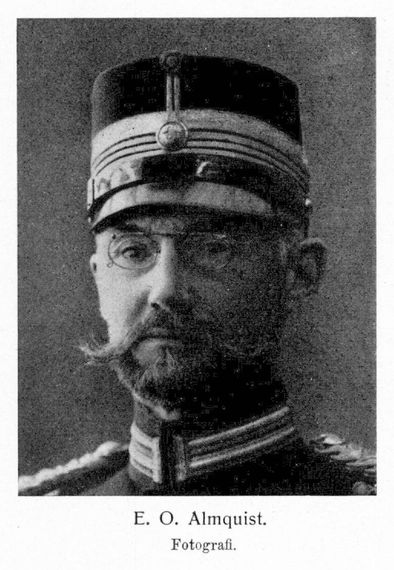 9. Erik Otto Almquist, bror till A. 6 och A. 7, f. 7 okt. 1861 i Skogs-Tibble. Genomgick Uppsala h. elementarläroverk; volontär vid Upplands regemente 8 mars 1878; avlade mogenhetsexamen i Uppsala 27 maj 1879 och officersexamen 1 nov. 1880; underlöjtnant vid Upplands infanteriregemente 19 nov. s. å.; utexaminerad från krigshögskolan 18 maj 1884 och från infanteriskjutskolan 20 sept. s. å.; tjänstgjorde för utbildning i gevärsteknik tre månader vid Huskvarna vapenfabrik 1885 och sex veckor vid artilleriets reparationsverkstäder i Stockholm 1886; löjtnant 29 aug. 1888; andre lärare vid infanteriskjutskolan 1890–93; K. M:ts ombud i Upplands, sedermera Uppsala läns skytteförbund 1893–1904; medlem i kommissionen för infanteriskjutskolans omorganisation 22 okt.–9 dec. 1897; kapten i armén 3 juni 1898 och i regementet 7 dec, 1900; förste lärare vid infanteriskjutskolan 1899–1904 enligt förordnanden av 31 dec. 1898 och 17 dec. 1901; kommenderad såsom skottställningsofficer vid Waffenfabrik Mauser i Oberndörff am Neckar okt. 1899–maj 1900; ledamot av centralstyrelsen för Sveriges frivilliga skytteföreningar, sedermera (1903) skytteförbundets överstyrelse 27 nov. 1901; ledamot i kommittén för prövning av automatiska pistoler 16 apr.–maj 1903; kapten av andra klass 17 juni s. å. och av första klass 4 aug. 1904; genomgick taktisk utbildningskurs för kaptener 6 juni–22 juli 1905; ledde en kurs i karbinskjutning vid Upplands artilleriregemente 1906; major i regementet 16 nov. s. å.; v. ordförande i skytteförbundens överstyrelses verkställande utskott 23 nov. s. å.; kommenderad att såsom sakkunnig biträda vid granskning av uppgjorda förslag till skjutinstruktion för trupper, beväpnade med 6,5 mm. gevär, m. m. 4 nov. 1907–27 juni 1908; major vid regementet 24 apr. 1908; överstelöjtnant 15 sept. 1911; ledamot av direktionen för Uppsala hospital och asyl jan. 1916; erhöll avsked från regementet 13 okt. s. å.; överste i femte arméfördelningens reserv s. d. RSO 1901; LKrVA 1904; erhöll Uppsala läns skytteförbunds guldmedalj 1906; RVO 1910.