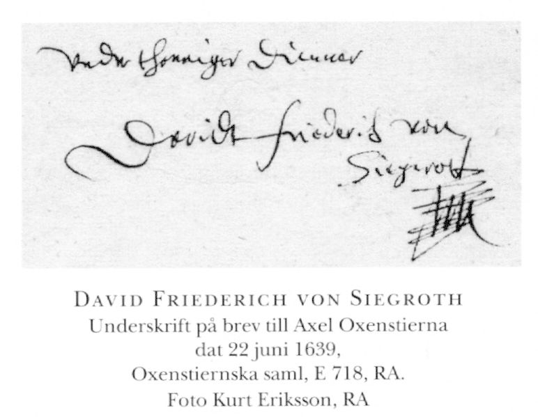 1 von Siegroth, David Friederich, d på hösten, före 15 nov, 1647 på resa i Tyskland (Hammarskiöld 1935, s 17). Föräldrar: översten Hans Heinrich v S o Barbara v Falckenhan. Elev vid hovskolan i Kassel, Tyskland, 12, kapten o chef för ett art:kompani i Sthlm sept 23–nov 25, tjänstgjorde som vardein (myntproberare) 26, bergsöverste 26, deltog i riksdagen 27, överstes titel senast 8 maj 29, assessor i Generalbergsamtet o generalbergshauptman 14 febr 37–44, förordn att undersöka möjligheterna att anlägga saltsjuderier 24 aug o 9 sept 39, förordn att tillsammans med Lorentz Creutz (bd 9) ha uppsikt över bergverken i Finland 3 juni 43-44, överste för artilleriet inrikes från 31 aug 44.