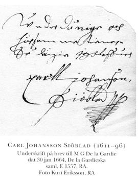 Carl Johansson S: Biographica S 35, Frilubrev, vol 2, M 1167 o Likv 5-6:169 o 94:268, RA; AOSB 1:14 (1950); B Asker, Officerarna o det sv samhället 1650-1700 (1983); Biographiskt lexicon öfver namnkunnige sv män, 14; J L Carlbom, Karl X Gustav (1910); Fortifik 3:1 (1908); AFryxell, Berättelser ur sv hist:en, 14 (1901); Frälseg 2:1-3:2 o 4:2-3 (1934-76); L Hammarskiöld, Om artillerireg:nas härkomst (KrVA:s tidskr 1940), s 96; dens, Artilleriledare under 1600-talet (Artilleri-tidskr, 74, 1945), s 250 o 253f; A Holmberg, Den Bergianska avsknsamken i VA:s bibi (1938), s 51; EJacobson, Från Nybrogatan, Riddarga-tan o Sperlingens backe (SSEÅ 1944), s 46; K artilleriet: Yngre Vasatiden (1985); d:o: Carl X Gustafs tid (1982); d:o: Karl XI:s o Karl XII:s tid (1993); Lags o doms; T Lenk, Flintlåstillverkn:ens införande i Sverige (KFÅ 1937), s 206-209; [S S Loenbom,] Hist märkwärdigheter, 4 (1781), s 120; L Magalotti, Sverige 1674 (1912); M v Plåten, Professorer o diplomater (Klient o patron, 1988); SMoK; A Spole, Obitum ... CaroliJohannis filil S (1697); SRP 8 o 16 (1898-1923); SRP: Stenogr prot, 1-2 (1975-83); B Steckzén, Krigskollejdi hist, 1 (1930); I Wadén, Per Knutsson Lillie (KFA 1955), s 97; P Wieselgren, Ny Smålands beskrim, 3 (1846), s 16; G Wittrock, Carl X Gustafs testamente (1908), s 23 o 57; dens, Karl XI:s förmyndares finanspolitik ... 1661-67 (1914), s 36, 348 o 384; F U W[rangel], Smärre personhistmeddekn (PHT 1901); dens, Rikskansleren Axel Oxenstiernas resa till o i Frankrike 1635 (1914), s 230.