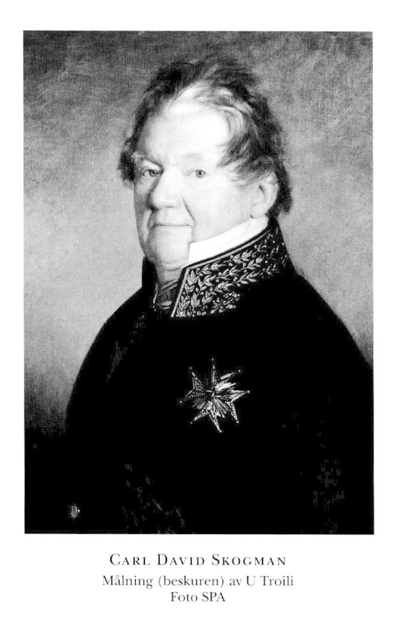 Skogman, Carl David, f 26 okt 1786 i Lovisa, d 20 febr 1856 i Sthlm, Finska. Föräldrar: prosten Jakob S o Maria Magdalena Starck. Elev vid Borgå gymn 98, inskr vid Åbo akad mars 01, kansliex där 7 juni 03, e o kanslist i inrikes civilexp 13 juli 04,ko-pist där 20 juli 06, auskultant vid Åbo hovrätt 04–05, kanslist i handels- o finansexp 29 juni 09, prot:sekr 16 aug 09, förste exp:sekr där 18 dec 11, tjänstg bl a som sekr i allm besvärs- o ekonomiutsk vid riksdagarna i Örebro 10 o 12, utsänd till England, Västindien o Nordamerika som rapportör 16 sept 12, biträde åt sv guvernören på Guadeloupe 21 febr 14, återkom till Sverige juli 15, led av 1812 års tullkomm sept 15–mars 17, dir i Sthlm för Göta kanalbolags diskont 16–18, sekr i finanskomm okt 17, led av komm ang undersökn av tillståndet i Gbgs stad o län april–maj 18, av statsberedn 21 okt 18, av komm ang förändrad räkenskapsmetod vid tullverket dec 18-aug 19, tf statssekr i handels- o finansexp 3 april 21, ord 9 mars 24–29 sept 38, led av generaltulldir 21 april 21-25, v ordf i dir för Sthlms stads sparbank 21, ordf där från 42, led av finanskomm maj 22–febr 23, av komm ang Sveriges o Norges ömsesidiga handels- o sjöfartsförhållanden april 24–april 25, av komm ang inrättandet av Teknologiska inst mars–maj 26, av inst:s dir från 20 april 27, ordf där 2 nov 38–1 jan 48, adl 11 maj 26, deltog i riksdagarna 28/30–53/54 (led av bankoutsk 44/45-47/48), led av komm ang tullrätterna sept 28–april 30, av komm ang ny instruktion o stat för Kammarrätten sept 28-dec 30, av komm ang ny organisation av Kommerskoll sept 28–mars 31, av komm ang ny organisation av hallrätterna sept 28–maj 33, tf överpostdir 21 nov 29–19 april 30 o 12 febr 31–1 febr 32, led av Nummerlotteridir 28 nov 29, kronoombud i Riksgäldskontoret 7 april 30, tf chef för Myntverket 24 juli 30–35, led av komm ang sättet för meddelande av kungörelser okt 30–febr 33, av beskattn:komm nov 30–dec 33, av komm ang karantänsanstalter mot koleran maj 31, tf president i Kommerskoll 28 sept 33, ord från 21 sept 38, led av komm ang underrättelser som skall uppläsas i kyrkan o vid häradsting jan 34–mars 37, av löneregleringskomm för K M:t:s kansli dec 34–april 35, av komm ang segelleden mellan Vänern o havet mars–aug 35, av kommissionen över Tabellverket 14 nov 35, av komm ang post- o diligensväsendet nov 35–juni 36, ordf i Konvojkommissariatet 36, i tulltaxekomm febr–juni 39, led av komm ang tid o sätt för ändrings sökande i ekonomi- o politiemål febr 43–jan 46, ordf i komm ang reorganisation av K teatern april 44, i komm ang reglering av brännvinsbränningen i riket juni 45–juli 47, led av styr för Sv slöjdfören 46, av dir för Abraham Rydbergs stiftelse 30 nov 46, av tulltaxeberedn mars–dec 47, av fullm i Riksbanken från 48, ordf i komm ang kreditförhållandenas ordnande juli 52–nov 53, led av riksrätten över statsrådets ledamöter 4 maj 54, frih 13 juli 54 (ej introd), ordf i komm ang rikets statistiska förhållanden dec 54, i komm ang Sveriges o Norges inbördes handelsförhållanden okt 55. – LVA 25 (preses 31–32), HedLVHAA 42, LSA 47, led av ett flertal sv o uti lärda sällsk.