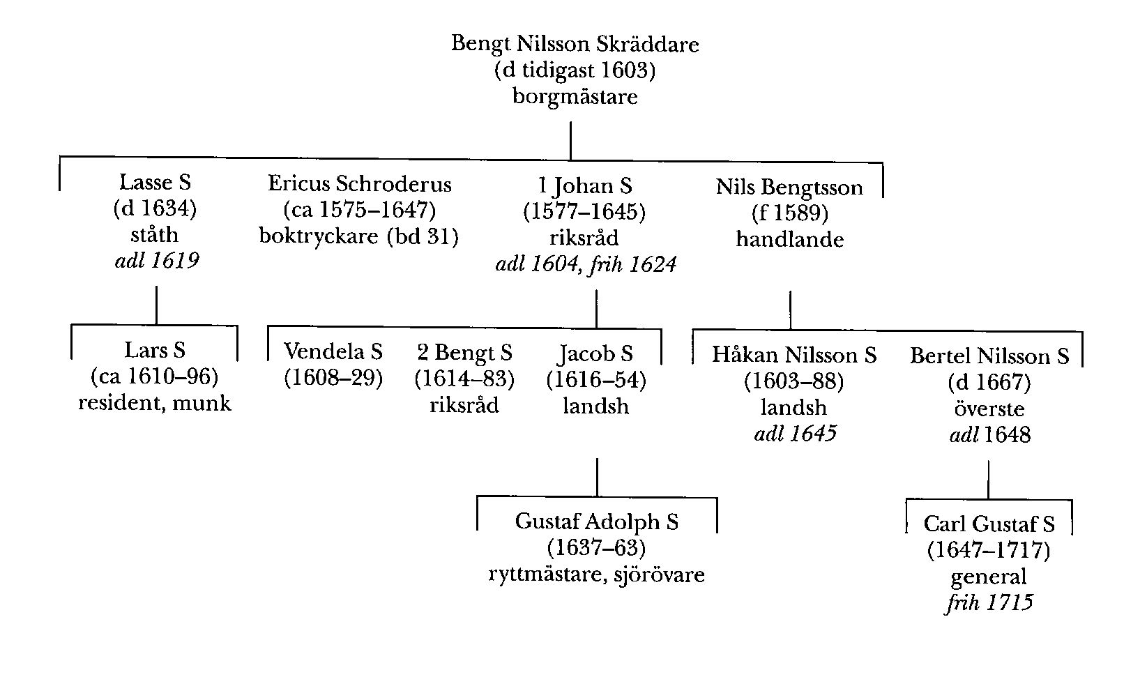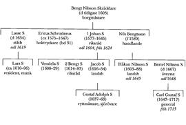 Sonson till Bengt Nilsson Skräddare var Håkan Nilsson S (1603–88), som deltog i 30-åriga kriget liksom i danska kriget 1644–45 och 1630 blev kapten vid Östgöta infanteriregemente och överstelöjtnant vid förbandet fem år senare. Efter att 1643 ha utnämnts till överstelöjtnant vid Kronobergs regemente utsågs han till överste och chef för detta följande år. S adlades 1645 (introd 1650) och adopterades på sin farbror Lars Bengtsson S:s nummer på Riddarhuset.