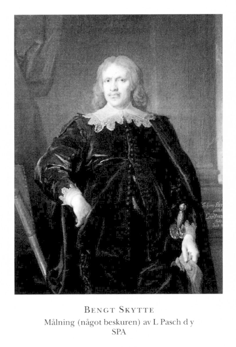 2 Skytte, Bengt, son till S 1, f 30 sept (Peringskiölds ättebok, RHA), dp 9 okt 1614 i Sthlm, Nik, d 1683 (bet för själaringn 20 juli i Sthlm, Jak). Frih 16 juni 24, inskr vid UU okt 24, medföljde Jakob Spens' legation till England 29, riddare där 29, kammarherre hos drottn Kristina 4 dec 33, gjorde ett flertal resor bl a till Tyskland, Frankrike, Italien, England o Holland 34–35, till bl a Amsterdam, Paris, Strassburg, Montpellier 41–42, till Turkiet 51–52, till flera länder 57–61 o 66–78, deltog i riksdagarna 35–41 och 43–49 (lantmarskalk 47), assessor i Kammarkoll:s kammarrevision 38, kammarråd 39 (avlade ed 27 sept), patronus för Skytteanska professuren i Uppsala från 45, landsh i Uppsala län 12 juni 46–49, även i Sthlms län, då länen sammanslogs, 47–49, riksråd 17 juni 48 (avlade rådseden 20 mars 49)–18 aug 64 (tjänstgjorde i kansliet 48–53 o 60–64), kansler för univ i Dorpat 3 okt 48–64, sändebud till Danmark 49, till Kurland o Litauen 55, guvernör i Estland juni 55–56, led av en kommission ang Bohuslän 30 juli 62, lagman i Ingermanland 14 febr 63 (tilltr ej), president i tribunalet i Wismar 31 mars 63 (tilltr ej), tillika legat i Tyskland 18 juli 63 (instr, tilltr ej).