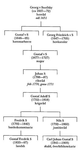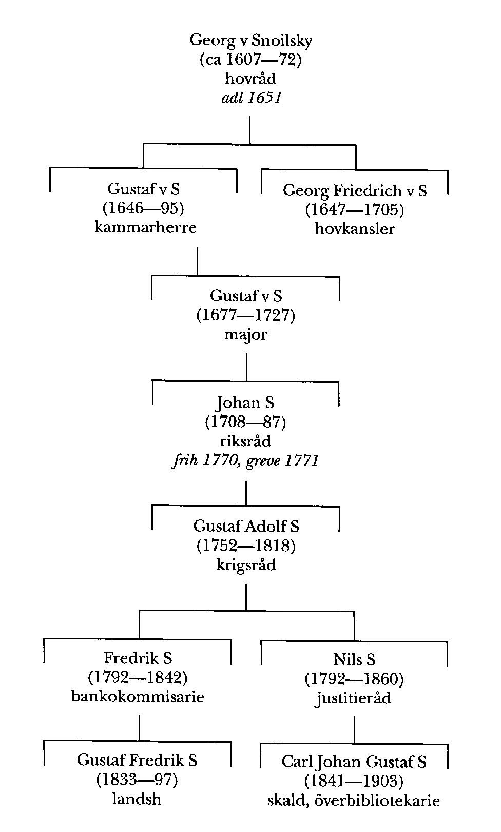 Snoilsky (v Snoilsky), släkt, sannolikt ursprungligen från Slovenien, av vilken en medlem 1610 blev adlad av kejsar Mathias. Georg S (ca 1607–72) trädde i jan 1632 i sv tjänst som krigssekreterare i fältmarskalk Gustaf Horns (bd 19) fältkansli och tjänstgjorde som sådan även under Johan Baner, Lennart Torstenson och i pommerska krigsstaten under Carl Gustaf Wrangel och utnämndes till pommerskt råd. S användes även i diplomatiska uppdrag. Han utnämndes 1644 till tysk fältsekreterare vid Krigskollegium med tjänstgöring i kollegiet men även i fält, vilket skedde under kriget i Skåne 1645. Under 30-åriga krigets slutskede var han, efter rekommendation av Lennart Torstenson, sv agent i Benfeld i Elsass 1646–49 och sändes, efter att ha biträtt Karl (X) Gustav vid fredsverket i Nürnberg, till Frankfurt am Main för att övervaka indrivningen av de för Sverige överenskomna satisfaktionspengarna. Till sitt biträde hade han bl a den unge Eric Dahlbergh (bd 9). S adlades 1651 med namnet von Snoilsky.