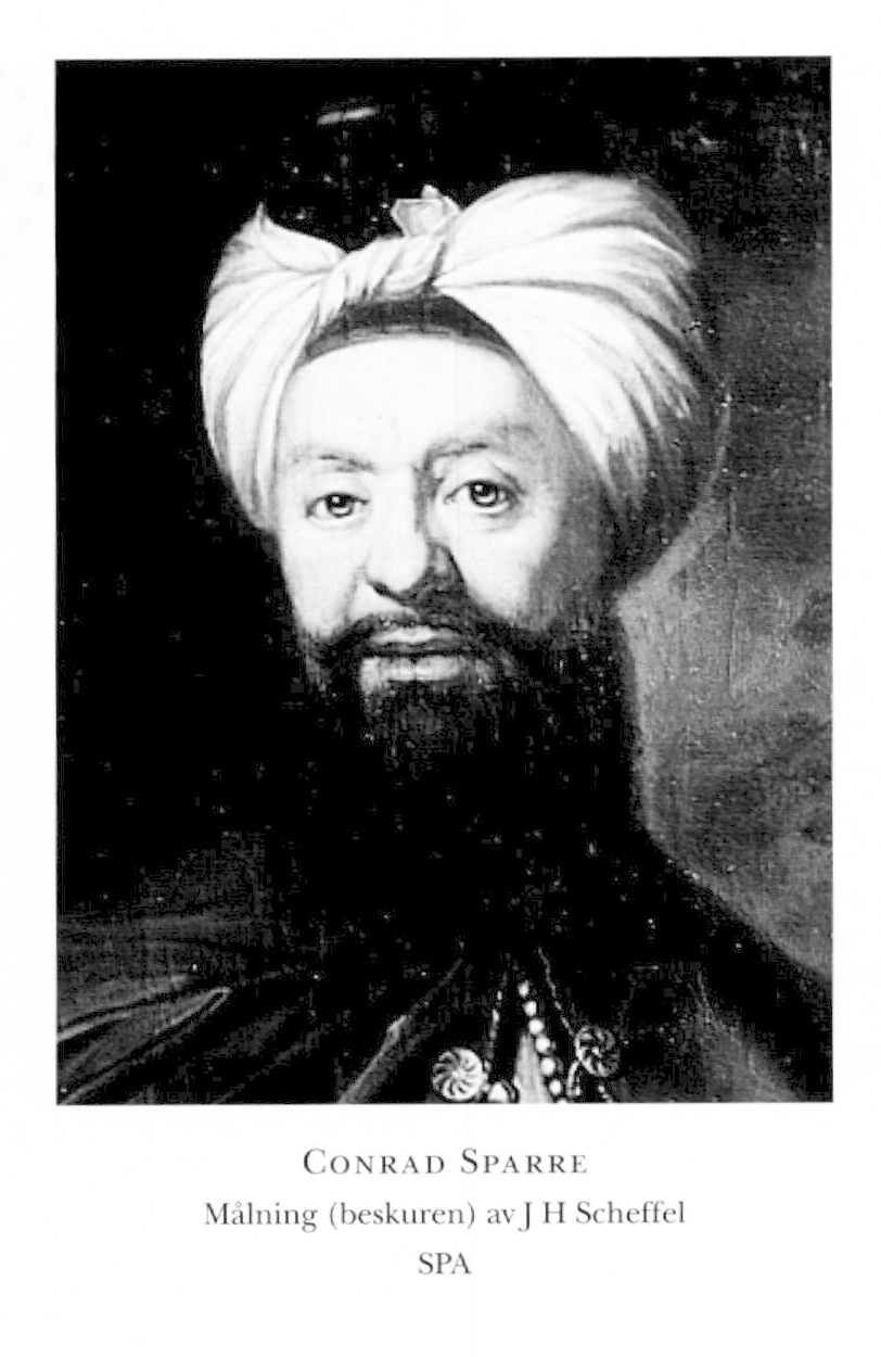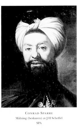 4 Sparre, Conrad, brorson till S 3, f 4, dp 8 dec 1680 i Sthlm.Jak o Joh, d 15 april 1744 i Malma, Skar. Föräldrar: kammarherren frih Carl S o Beata Elisabet Falkenberg. Inskr vid UU 31 jan 88, page vid hovet 7 maj 97–98, kadett vid Erick Sparres reg i fransk tjänst okt 98, fänrik 00, löjtms fullm 02, kaptens fullm 06, avsked ur fransk tjänst 06, volontär vid sv armén i Sachsen 07, löjtn vid Livdragonreg 08, kapten vid Närkes o Värmlands reg 09, tjänstg vid Karl XII:s hov i Bender 09–10, företog tills med C Loos (bd 24) o H Gyllenskiepp (bd 17) en sv expedition till Konstantinopel, Egypten o Palestina 21 jan 10–18 juni 11, kapten vid Livg 10 nov 11, vid Stanislaw Leszczynskis garde maj 14, överstelöjtn vid Hallands reg 7 dec 17, överstes avsked 7 sept 19, deltog i riksdagarna 19 o 23–40/41.