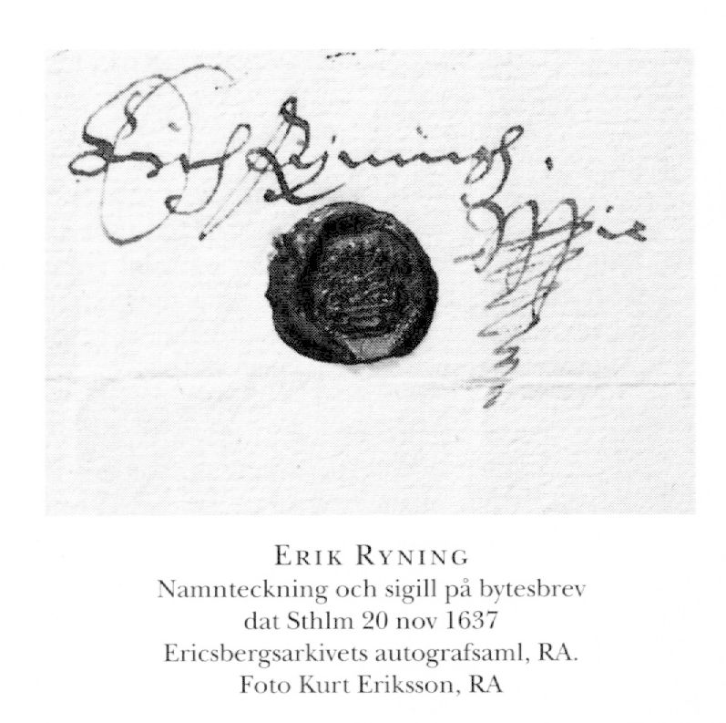 Ryning, Erik, f 1 nov 1592 i Juli ta, Söd (Epitaphium, se Hallman, s 64), d 6 dec 1654 i Sthlm (anf källa; bet för själaringn 13 dec bl a i Jak o Joh). Föräldrar: ståthållaren Erik R o Anna Månsdtr (Lilliehöök). I nederländsk krigstjänst, fänrik vid Hovreg 18, kammarjunkare hos konungen 20, kapten vid Arvid Hands (bd 18, s 235) östgötska fältreg 21, överstelöjtn vid Alexander Leslies (bd 22) landsreg från Södermanland, Närke o Värmland 22, vid dennes reg från Närke o Värmland 26, guvernör i Elbing 27–29, överste för Södermanlands reg 27–29, kommissarie vid underhandl:arna med Polen 27–28, led av preussiska hovrätten 29, befälhavare för en flotteskader 5 juni 29, vice amiral juni 30, guvernör i Stralsund 5 nov 30, i Wismar trol 5 jan 32 (tilltr ej), ståth på Älvsborg 10 aug 32 (tilltr ej), riksråd 4 febr 33, amiralitetsråd i Amiralitetskoll 23 mars 33–6 dec 50, administratör vid k hovet i Nyköping 26 aug 33, lagman i Södermanland från 4 mars 34, häradsh i As hd, Älvsb, 19 dec 34–52, generalguvernör i Livland 30 april–12 aug 44, kommenderande amiral över huvudflottan samt flottstyrkorna i Wismar o Gbg 21 maj 45, frih 15 dec 51 (introd 52).