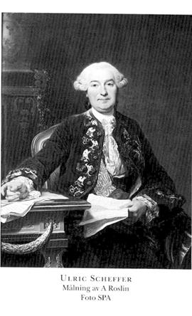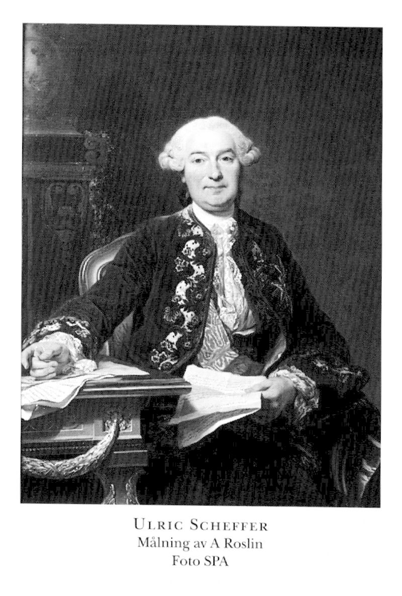 3 Scheffer, Ulric, bror till S 2, f 5 aug 1716 i Nyköping (fdb saknas), d 4 mars 1799 i Ek, V Götaland. Inskr vid UU 1 febr 28, auskultant i Kommerskoll 2 maj 33, notarie där 35, auskultant i Svea hovrätt 17 mars 36, hovjunkare 5 juli 36, deltog i alla riksdagar 40/41–55/56 o 65/66–78/79 (led av kammar- ekonomi- o kommersdeput 40/41, av justitiedeput 46/47, av SU 51/52–55/56, av handels- o manufakturdeput 55/56), kuriruppdrag 41, volontär vid armén i Finland o adjutant med löjtn:s grad hos general C E Lewenhaupt (bd 22) sept 41, löjtn vid Karelska dragonreg 2 jan 42, kapten vid franska reg Royal Suédois 20 juli 42, i fransk tjänst maj 44–51, generaladjutant hos prins Friedrich av Zweibrücken febr 45, kapten vid Jönköpings reg 26 juni 45, överstelöjtn vid Fersenska reg i fransk tjänst 1 nov 45, överste i franska armén 15 aug 47, generaladjutant i sv armén 15 mars 50, överstelöjtn vid Jämtlands dragonreg 31 okt 50, led av förkortn:kommissionen juli 51, sv minister i Paris 9 mars 52, e o ambassadör där 8 maj 61–1 april 65, överste i armén 22 april 60, överstelöjtn vid Upplands reg 19 mars 63, överste vid Kronprinsens reg (Konungens eget värvade reg) 11 april 64, vid Västgöta-Dals reg 9 juni 66–25 april 69, riksråd 5 maj 69–12 maj 72, rikskansliråd 25 maj 69–12 maj 72, greve 12 maj 71 (ej introd), tf kanslipresident 9 okt 71–12 maj 72, åter riksråd o kanslipresident 22 aug 72–5 juni 83, kansler för Åbo akad 5 okt 72–5 juni 83, ordf i Riksgäldsdir 4 aug 77–5 juni 83, led av kommissionen ang fartygscerter jan–maj 80. – Serafimerriddare 26 nov 70, LVA 76, LPS 79.