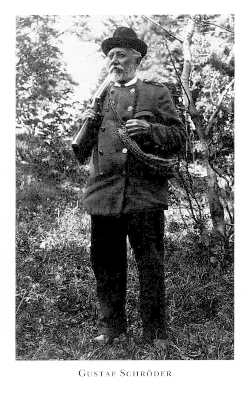 1891. 272 s. - Svenska jagten. Praktisk hjälpreda för unga jägare. Sthlm 1891. 218 s. 2. genoms uppl 1910. 217 s. - En bruksbokhållares minnen. Serie [l]-2. Sthlm 1892, 1903. 268, 250 s. [Nya utg: 1-2.] Gbg 1912-13. 1. 304 s. 2. Från brukskontor och timmerskog. Ur en ... 288 s. 2. uppl i billighetsedition 1914. Sthlm 1978. 295 s. (Svenska bokskatter.) - Örjan Kajland och hans pojkar. Skildringar från svenska finnarnes lif och jagter i Värmlands och Dalarnes skogsbygder. Sthlm 1893. 260 s, 4 pl o karta på omsl. [Nya utg:] 2. förk uppl: ... för ungdomen berättade. 1903. 159 s. ([Omsl:] Gossarnas äfventyrsböcker, 11.) Gbg 1913.160 s. (Åhlén & Åkerlunds 25 öres böcker.) Sthlm 1917. 160 s. 1928. 206 s. (AFA:s Röda bibliotek [pärm].) 1933. 220 s. Önskeböckerna, Bibliotek för ungdom.) ... pojkar. Svenska finnarnas liv ... Malung & Arvika 1992. 203 s. (Gustaf Schröder-sällskapet, skriftserie, nr 2.) Övers: Yrjänä Kailanenja hanen poi-kansa, Porvoo 1894, 232 s, 5 pl. - En timmermärkares minnen. Sthlm 1893. 264 s. [2. uppl] Sthlm & Gbg 1914. 280 s. [Ny utg] Malung & Arvika 1994. 230 s. (Gustaf Schröder-sällskapet 3.) - Gamla minnen. Sthlm 1894. 269 s, 1 portr. [Ny utg] Malung & Arvika 1995. 213 s. (Ibid, 4.) - Från pojk-och gubbaren. Jagt-och fiskehistorier. Sthlm 1894. 268 s. - Pekka Huskoi-nen. En drifvar-finnes lif och jakter i Vermlands och Dalarnes skogar (forts af "Örjan Kajland och hans pojkar"). Sthlm 1895. 279 s, 4 pl. 2. förk uppl: Pecka... skogar. 1906. 166 s. ([Omsl:] Gossarnas äfventyrs-böcker, 14.) [Nya utg:] Pekka ... En drivar-finnes liv... i Värmlands och Dalarnas skogar. Vol. 1-2. 1913.159, 160 s. 1917. Arvika & Malung 2000. 248 s. (Gustaf Schröder-sällskapet9.) - Tjugo år i Dalarne. Skildringar. (Ny följd af "Bruksbokhållarens" och "Tim-mermärkarens" minnen.) Sthlm 1896. 259 s. [Ny utg] Malung & Arvika 1997. 212 s. (Ibid, 6.) - Pavo Makkran. Bilder från finnarnas lif under Krabbe- och Gyl-denlöwe-fejderna i Vermland (forts på Örjan Kajland" och "Pekka Huskoinen"). Sthlm 1896. 258 s, 4 pl. [Ny utg] Malung & Arvika 1998. 208 s. (Ibid, 7.) - Barne-minder og bj0rnejagt. Kristiania 1897. 171 s. [Övers ur flera av samlingarna ovan.] - Björnjägaren Jan Finne / Sista älgjakten / En ripjakt under vintern / Åt östra bergen / I hyttskogen (G S m fl, Från skilda marker Sthlm 1897, s 1-13, 14-29, 72-82, 93-116, 125-165). - Jägaren under nya jaktstadgan. Några vördsamma bemärkningar af Gammal Skogsman. Sthlm 1898.31 s. [Anon.] - Den gamle fogdeskrifvaren. Berättelser från Värmlands gränsbygder vid seklets början. Sthlm 1898. 260 s. -Jagt, fiske och vildmarks-lif. Sthlm 1899. 253 s. - Finntorpet i Västerskogen. Fortsättning och slut på berättelserna om Örjan Kajland, Pekka Huskoinen och deras ättlingar. Sthlm