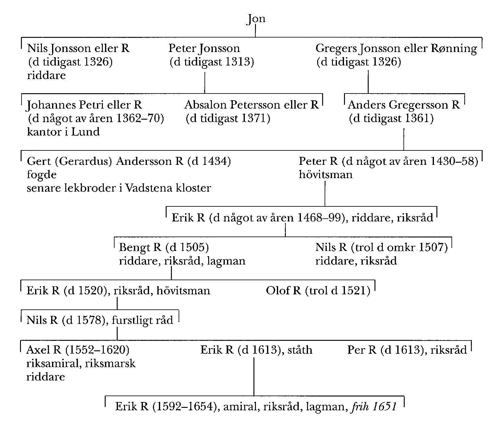 Enligt ett endast i dansk översättning känt brev från 1326 pantsatte "Niels Jenssen som kaldis Rønning" till sin hustru Siøgaard på Fyn, varvid den förutnämnde brodern Gregers, tydligen Anders Gregersson R:s far, namnes med tillnamnet "Rønning". 1397 fick "Gerardus Anderson dictus Rynigh", senare känd som Gert R (d 1434) intyg från Asums häradsting på Fyn, att riddaren Nils R – tydligen identisk med Nils Jonsson och "Niels Jenssen som kaldis Rønning" – aldrig avhänt sig Rönninge "Syogordh" och begravts i Rönninge kyrka. Gert R var en av de danskar som av drottning Margareta utnämndes till fogdar i Sverige. Han torde nämligen vara identisk med den utan förnamn nämnde R som våren 1412 var fogde på Borgholm, ty i ett brev från 1434 uppges att han som fogde där tagit jord från en redan 1413 avliden frälsekvinna. På hösten 1412 blev han lekbroder i Vadstena kloster, för vars räkning han 1416–20 vistades i Danmark för grundandet av Maribo kloster på Lolland. R dog i Danzig (Gdansk), dit han enligt Vadstenadiariet rest för att få sina ben kurerade.