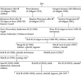 Peter R:s son Erik R (d något av åren 146899) namnes tidigast 1450 och var redan då riddare. Sannolikt hade han dubbats vid kung Karls kröning i Sverige 1448 eller i Norge 1449. Under Kristian I:s regering blev R riksråd, möjligen redan 1460 och säkert senast 1463. Som sådant kan han beläggas ännu 1466 (Bring). R:s sätesgård var Högsrum i Fliseryd, Handbörds hd i Småland, varav han kommit i besittning genom sitt äktenskap med den i det sv lågfrälset ingifte danske frälsemannen Erik Pederssons (Urup) dotter Kerstin.