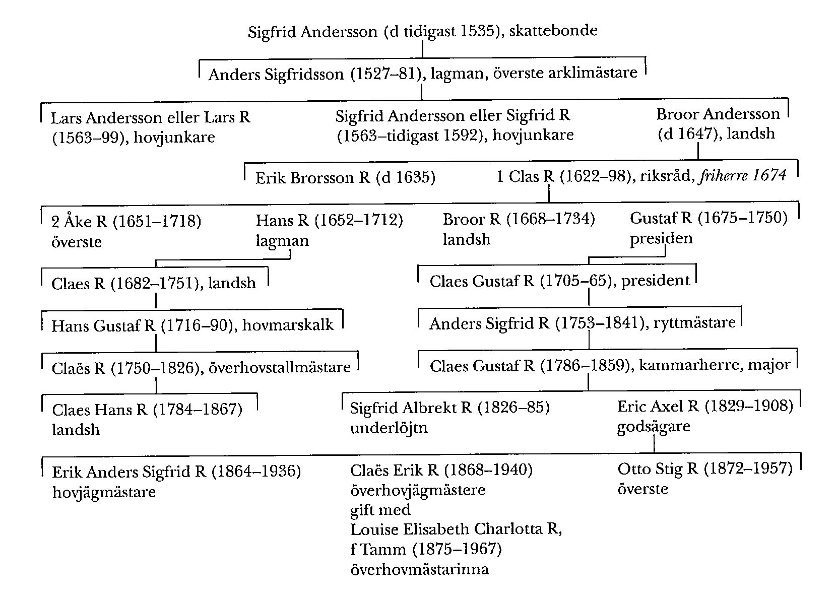 I sitt äktenskap med sin förutnämnde brorson Claes R:s svägerska Hedvig Douglas blev R far till Claes Gustaf R (1705–65), vilken alltså var kusin på mödernet till sitt förut nämnda kusinbarn på fädernet Hans Gustaf R. Detta gjorde att han 1750 kunde börda det av Claes R 1748 sålda Högsjögård. Efter sin far ärvde R Bysta i Asker, Or, som kommit till denna släkt genom Broor Anderssons andra äktenskap, och Nynäs i Bälinge, Söd, som fadern ärvt efter en mödernesläkting. 1756 köpte han Segersjö i Lännäs, Or, och 1763 ärvde han Björkvik i Östra Ryd, Ög, efter en farbror. R hade blivit kammarherre 1723 och kammarråd 1737 samt blev landshövding i Södermanland 1751 och president i Kommerskollegium 1761 och i Statskontoret 1762.