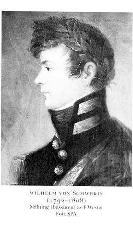 En son till S 1 var den som blott 15-åring stupade Wilhelm Johan Ludvig v S (1792–1808), som genom Runebergs dikt Wilhelm von Schwerin (i Fänrik Ståls sägner) har blivit en litterär gestalt. Han antogs till kadett vid Karlberg 1806, utexaminerades 1808 och åtföljde som underlöjtnant Svea artilleriregemente till Finland. Redan i sin första strid utmärkte han sig, då han på en förpost vid Ömossa 6 sept s å förde befäl över två sexpundiga kanoner och ett fåtal artillerister och under en lång stund lyckades hejda framryckningen av en överlägsen rysk styrka. Han blev flera gånger sårad under "Oravais' blodiga dag" 14 sept s å och dog den 27 i samma månad, ej under själva slaget, som Runeberg med diktarens frihet framställt händelsen. Förlaga för huvuddelen av Runebergs dikt är det brev som S skrev till föräldrarna från sjukbädden 17 sept. Om än i detaljer inte helt korrekt har detta av tydlig stolthet präglade brev i huvudsak bedömts överensstämma med andra samtida källors vittnesbörd både om händelseförloppet i stort och om S:s egen insats i striderna (Hornborg).