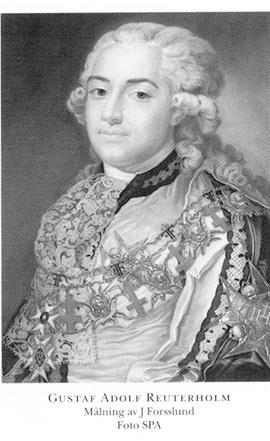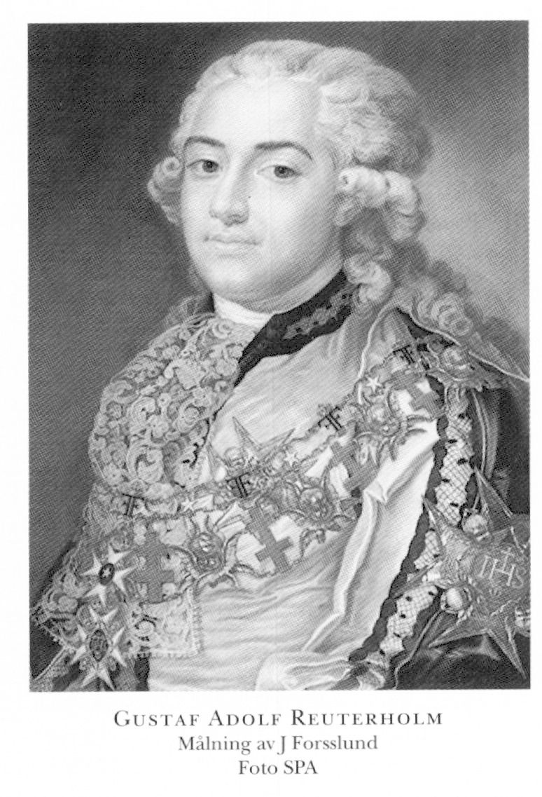 4 Reuterholm, Gustaf Adolf, son till R 2, f 7 juli 1756 i Sjundeå, Nylands län, d 27 dec 1813 i Schleswig-Friedrichsberg, Tyskland. Inskr vid UU 14 febr 69, volontär vid Västmanlands reg 16 sept 70, sergeant där 15 juni 71, vid Östgöta infanterireg 22 mars 73, fänrik i armén 30 nov 74, placerad till tjänstgöring vid Västmanlands reg 22 maj 75, avsked ur krigstjänsten 1 sept 77, hovjunkare hos Gustav III 15 sept 77, kammarherre hos drottn Sofia Magdalena 27 dec 78, deltog i riksdagarna 86 o 89, led av Generaltulldir 87–93, överkammarherre hos änkedrottn 3 juli 92, president i Kammarrevisionen o led av hertigen-regenten Karls konselj 7 juli 92, tf rikskansler 6 juni 96, entledigad från sina ämbeten 22 okt 96, vistades utomlands 96–97 o från 00. – En av rikets herrar 17 maj 93, Serafimerriddare 24 nov 94, hedersled av K målar- o bildhuggarakad 95, LVA 96. – Ogift.
