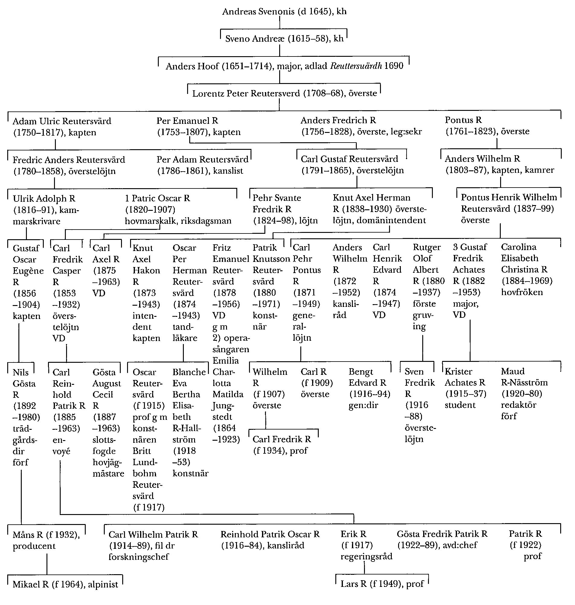 Reuterswärd (Reuttersuärdh; Reutersverd; Reutersvärd), släkt, som härstammar från kh Andreas Svenonis (d 1645) i (Norra) Härene, Skar. Han efterträddes som kh av sin son Sveno Andreae (1615–58). Dennes son (Stiernman) Anders Hoof (1651–1714) deltog i slagen vid Halmstad och Lund 1676 samt Landskrona 1677, befordrades till löjtnant 1678, adlades 1690 med namnet R (så i sköldebrevet), blev ryttmästare 1703, sårades i slaget vid Helsingborg 1710 och fick s å avsked med majors karaktär.