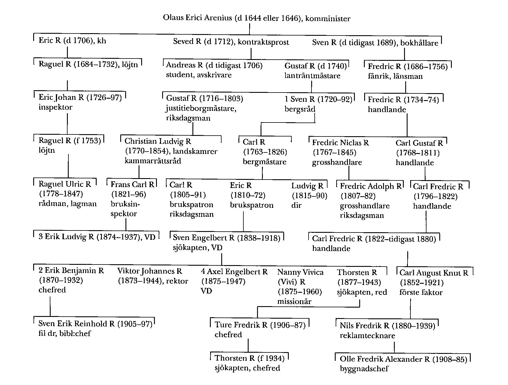 Hans äldste son, kh Eric R (d 1706) i Herrestad, Ög, blev farfars farfar till rådmannen i Sthlm Raguel Ulric R (1778–1847), som fick lagmans n h o v 1836.