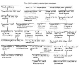 Eric R:s yngste bror var far till fänriken, sedermera länsmannen Fredric R (1686–1756), som var i fångenskap 1713–19 efter Tönnings kapitulation. Denne blev farfars far till grosshandlaren i Sthlm Fredric Adolph R (1807–82), som var riksdagsman 1850–66 och ledamot av Sthlms stadsfullmäktige 1863–76. En av hans kusiner var farfar till Carl August Knut R (1852–1921). Knut R var under mer än ett halvsekel anställd hos Bonniers, där han avancerade till förste faktor i tryckeriet och blev "känd, värderad och älskad av många av Sveriges författare och författarinnor" (K O Bonnier). Sonson till honom var Olle Fredrik Alexander R (1908–85). Olle R utexaminerades från KTH 1932 och befordrades i Väg- och vattenbyggnadskåren till överstelöjtnant 1964. 1953–68 var han byggnadschef i Byggnadsstyrelsen.